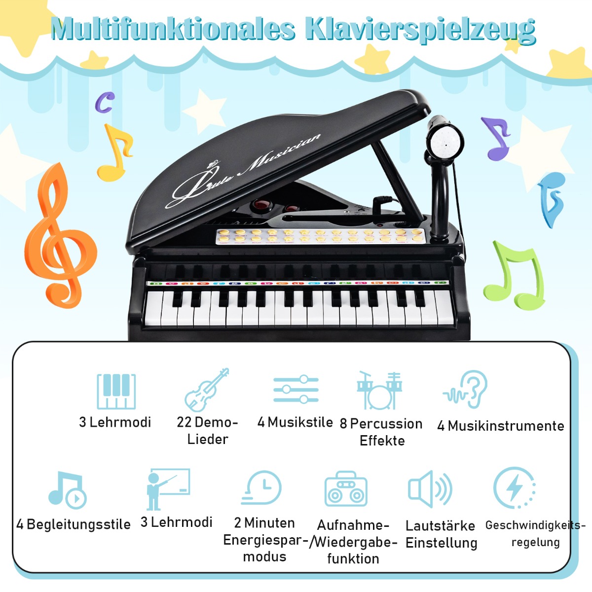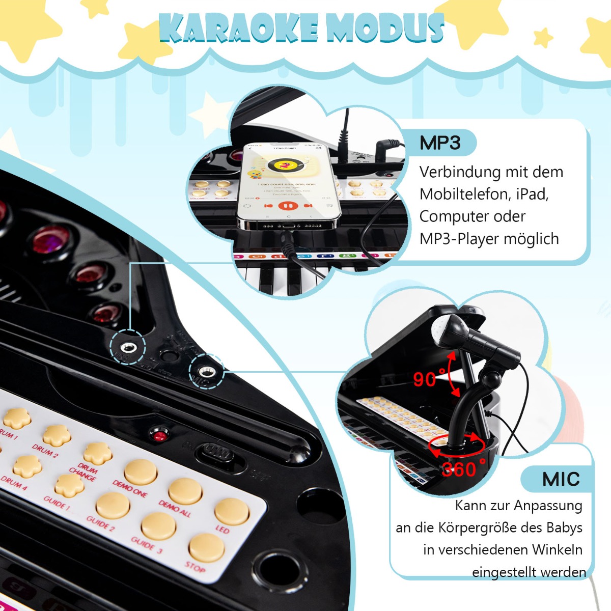- Καραόκε Λειτουργία: Το μικρόφωνο επιτρέπει στα παιδιά να εξασκούν το τραγούδι ενώ παίζουν πιάνο. Η MP3 διεπαφή συνδέεται με κινητά ή MP3 players για περισσότερη διασκέδαση.