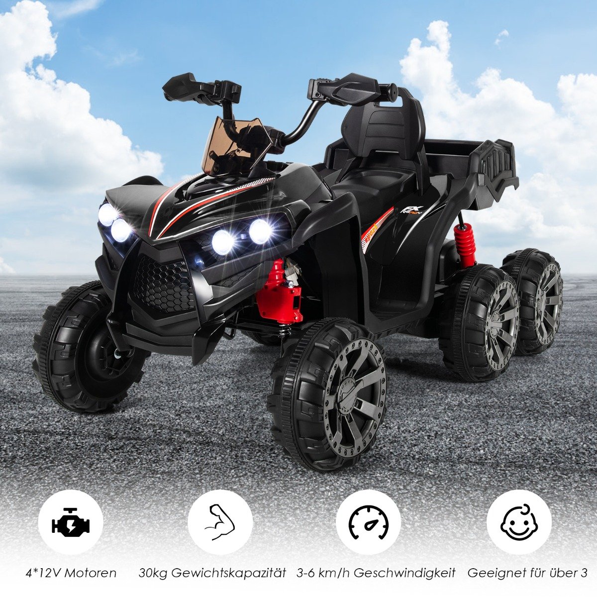 Το παιδικό μας Quad είναι η τέλεια λύση για να συνοδεύσετε τα παιδιά σας και να τους προσφέρετε χαρά. Η εντυπωσιακή εμφάνιση του Quad, τα φωτεινά LED φώτα, η μουσική και το κουμπί ιστορίας προσφέρουν επιπλέον διασκέδαση στα παιδιά. Επιπλέον, το φαρδύ κάθισμα και το άνετο υποπόδιο προσφέρουν την υψηλότερη άνεση. Ο σχεδιασμός της πλάτης μπορεί να προστατεύσει τα παιδιά από το να αναποδογυρίσουν ξαφνικά προς τα πίσω. Σε αυτό το όχημα, τα παιδιά σας μπορούν να πάρουν παιχνίδια και σνακ. Επιπλέον, οι 6 ανθεκτικοί τροχοί του είναι κατάλληλοι για ξύλινα δάπεδα, λαστιχένιες αλυσίδες και τσιμεντένιους δρόμους. Εξοπλισμένο με 4 κινητήρες κίνησης, η ταχύτητα του οχήματός μας μπορεί να φτάσει τα 3-6 km/h. Επιπλέον, η επαναφορτιζόμενη μπαταρία (12 V, 10 Ah) και ο πιστοποιημένος φορτιστής UL εξασφαλίζουν ότι τα παιδιά μπορούν να απολαύσουν την οδήγηση για περισσότερα από 40 λεπτά μετά τη φόρτιση. Είναι ένα ιδανικό δώρο για παιδιά άνω των 3 ετών.