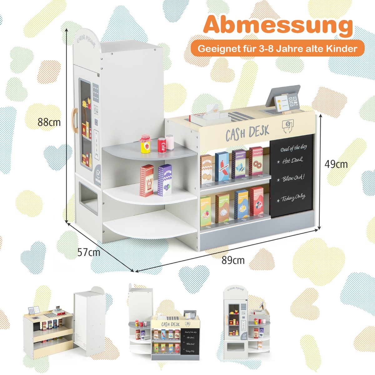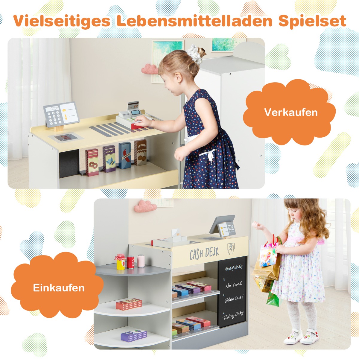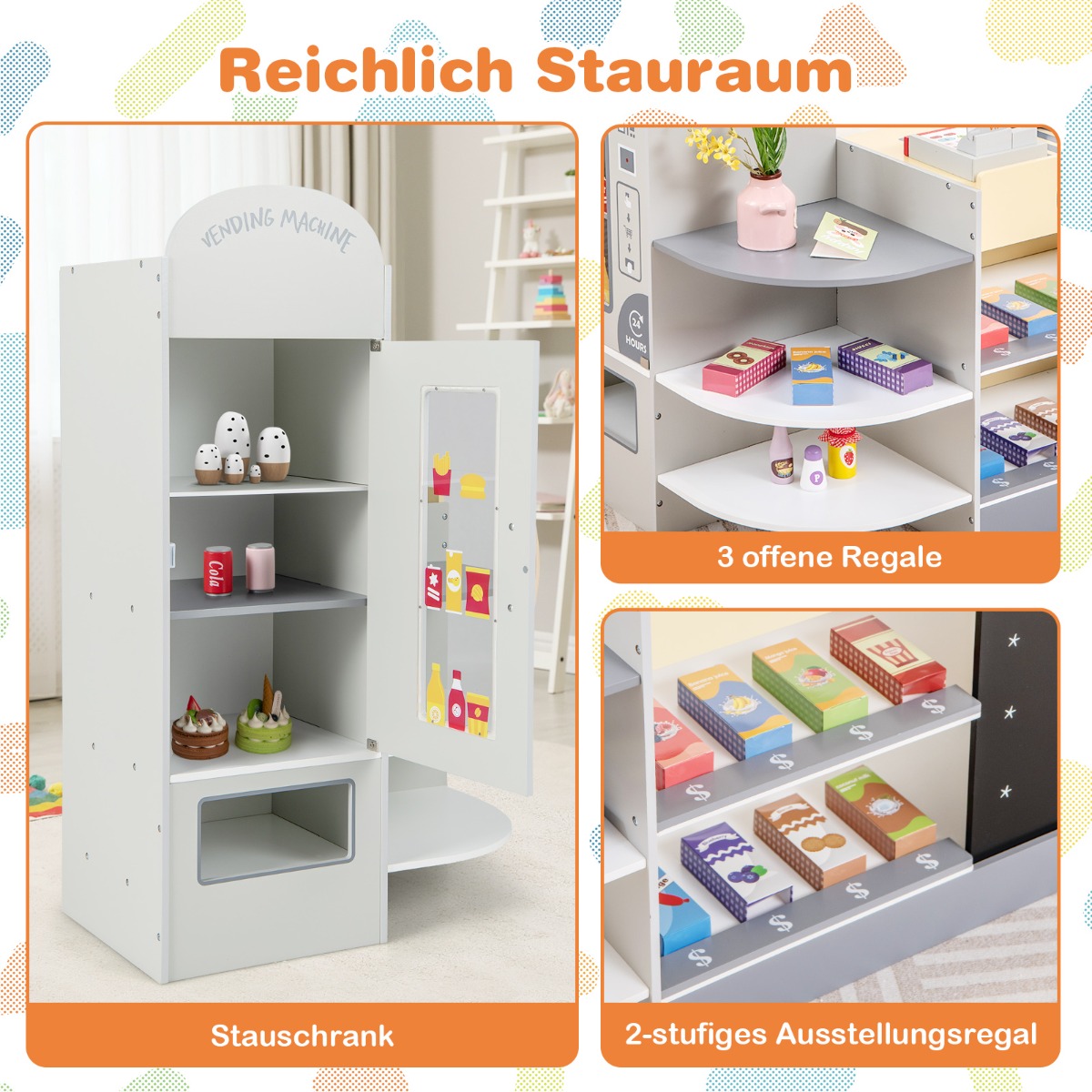 Αφήστε τα παιδιά να διασκεδάσουν με το ξύλινο σετ σούπερ μάρκετ μας! Ο πλευρικός αυτόματος πωλητής επιτρέπει στα παιδιά να προσποιούνται ότι τοποθετούν σνακ και ποτά, να αγοράζουν διάφορα είδη ή να αφαιρούν προϊόντα. Τα μικρά παιδιά μπορούν επίσης να γράφουν τιμές στον πίνακα ή να προσομοιώνουν το ταμείο με μια ξύλινη μηχανή POS και μια πιστωτική κάρτα, μαθαίνοντας για τα χρήματα. Επιπλέον, υπάρχουν 3 ανοιχτά ράφια και 2 εκθεσιακά σταντ για αποθήκευση, βοηθώντας τα παιδιά να αναπτύξουν καλές συνήθειες οργάνωσης. Όλες οι γωνίες και οι άκρες είναι στρογγυλεμένες και χωρίς γρέζια.