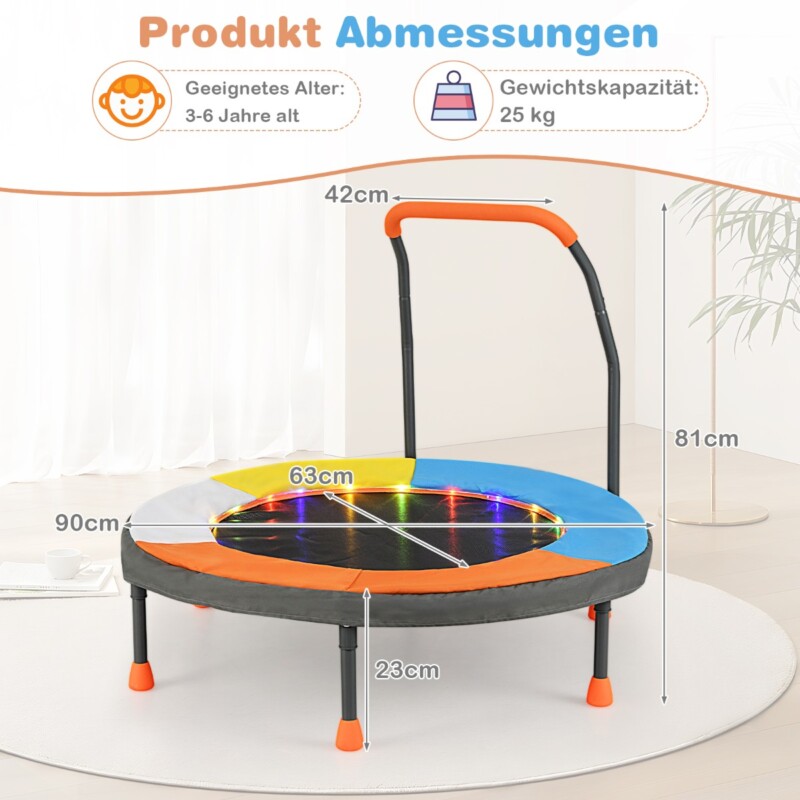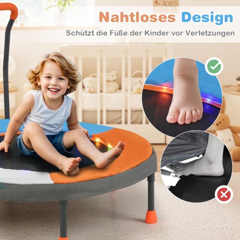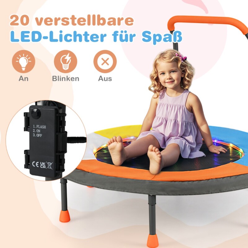 Αφήστε τα παιδιά σας να πηδήξουν για διασκέδαση και υγεία! Τα πολύχρωμα LED φώτα στο στρώμα άλματος προσφέρουν 3 λειτουργίες φωτισμού. Αυτό το μίνι τραμπολίνο για παιδιά έχει σχεδιαστεί χωρίς ελατήρια και χρησιμοποιεί ζώνες τάσης για ασφαλέστερο και πιο ομοιόμορφο άλμα. Ο επικαλυμμένος με πούδρα σκελετός και τα αντιολισθητικά μαξιλαράκια ποδιών εξασφαλίζουν σταθερότητα και αντοχή. Συναρμολογείται εύκολα και διπλώνει για αποθήκευση. Ιδανικό για εσωτερική και εξωτερική χρήση, προσφέρει στα παιδιά μια ασφαλή και διασκεδαστική επιλογή παιχνιδιού.