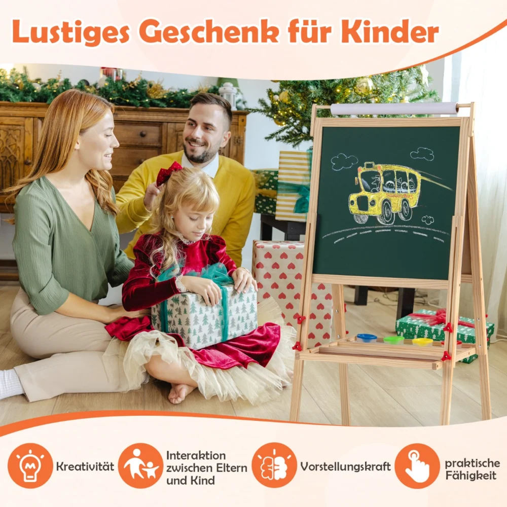 Η διπλής όψης καβαλέτα είναι το τέλειο δώρο για αγόρια και κορίτσια, βοηθώντας τα να αναπτύξουν τις δεξιότητες σχεδίασης και γραφής τους. Διαθέτει μαυροπίνακα, λευκό πίνακα και εναλλάξιμο ρολό χαρτιού για να ζωγραφίζουν με τους φίλους τους. Ο μαγνητικός μαυροπίνακας και ο λευκός πίνακας διευκολύνουν την τοποθέτηση γραμμάτων, αριθμών και σχημάτων για εκπαιδευτική διασκέδαση. Με ρυθμιζόμενο ύψος, είναι ιδανική για παιδιά ηλικίας 3 έως 10 ετών. Επιπλέον, 2 δίσκοι και 4 κύπελλα χρωμάτων εξασφαλίζουν τακτική αποθήκευση των πινέλων. Ο σκελετός σε σχήμα Α και τα σταθερά πόδια εξασφαλίζουν σταθερότητα.