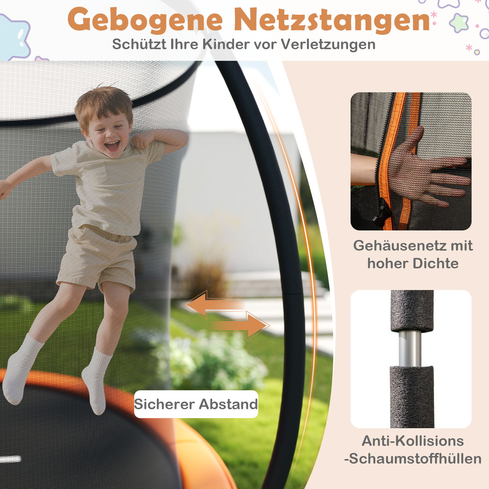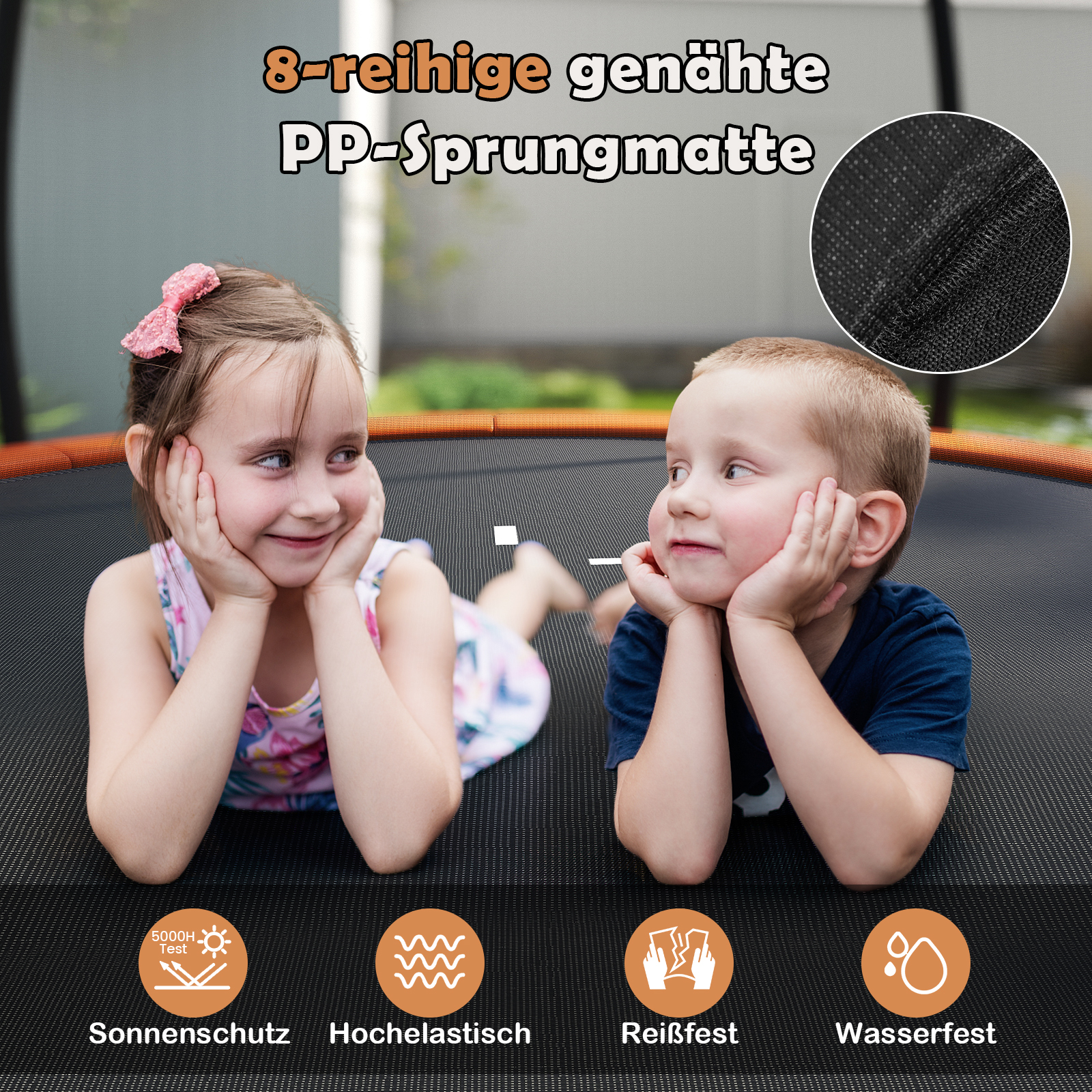 Ο σχεδιασμός ασφαλείας περιλαμβάνει καμπύλες ράβδους και μια στεγανή στερέωση του διχτυού για την αποφυγή τραυματισμών. Οι καμπύλοι σωλήνες ποδιών αυξάνουν τη σταθερότητα, ενώ τα βαρέως τύπου ελατήρια και το ανθεκτικό στη σκουριά, γαλβανισμένο πλαίσιο από χάλυβα εξασφαλίζουν μακροχρόνια ποιότητα. Θα απολαύσετε ένα υψηλό άλμα στο αντιολισθητικό χαλί με το ανθεκτικό δίχτυ ασφαλείας. Η σκάλα προσφέρει εύκολη πρόσβαση και η επενδυμένη κάλυψη ελατηρίων αυξάνει την άνεση και την ασφάλεια της εμπειρίας σας στο τραμπολίνο.