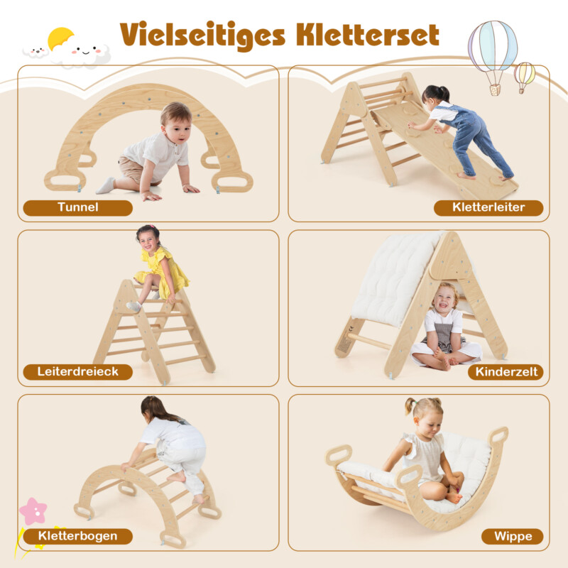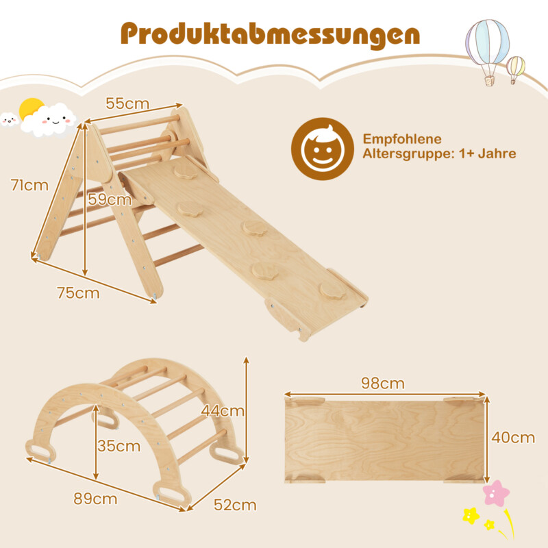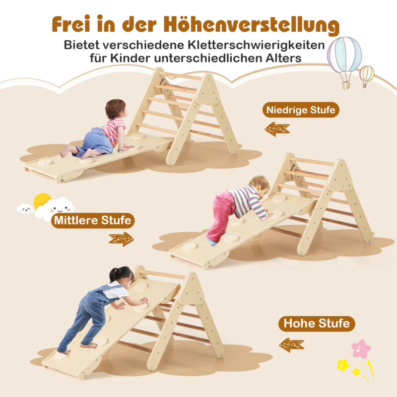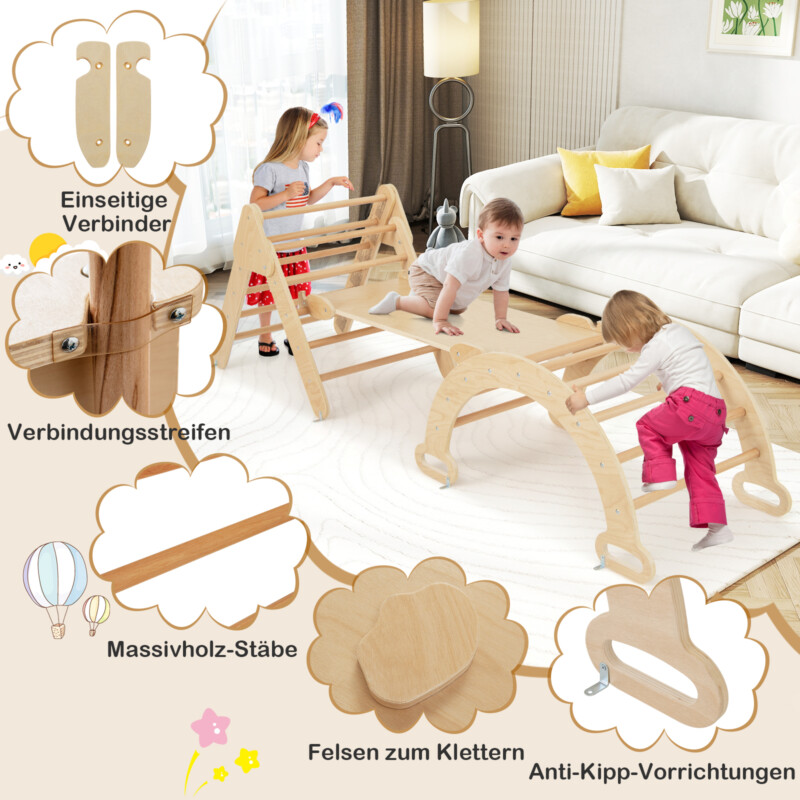Προσφέρετε στα παιδιά σας αμέτρητες ώρες διασκέδασης με αυτό το σετ αναρρίχησης τριγώνου. Το παιχνίδι αυτό περιλαμβάνει ένα τρίγωνο αναρρίχησης, μια καμάρα και μια ράμπα, δίνοντας άπειρες επιλογές παιχνιδιού. Κάθε στοιχείο μπορεί να χρησιμοποιηθεί ξεχωριστά ή σε συνδυασμό για ποικιλία στη διασκέδαση. Η ράμπα διαθέτει δύο διαφορετικές πλευρές, προσφέροντας μοναδικές εμπειρίες αναρρίχησης και τσουλήθρας. Επιπλέον, η καμάρα μπορεί να αναστραφεί και να μετατραπεί σε κούνια!
