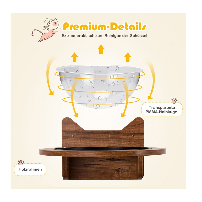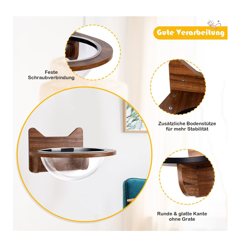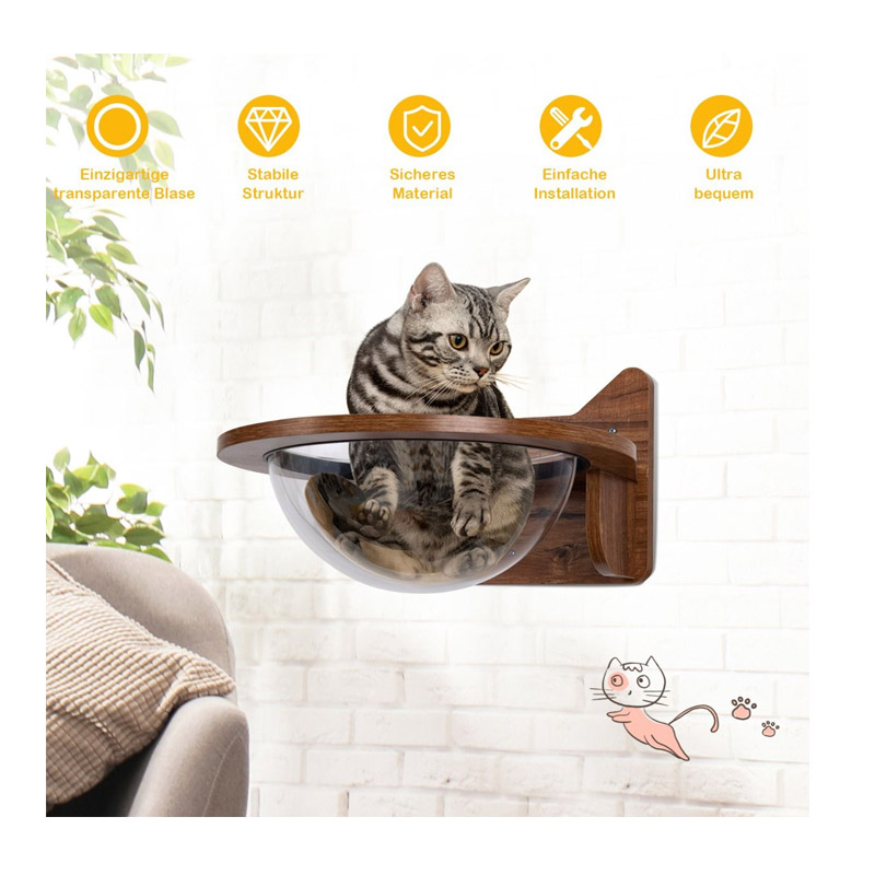 Το επιτοίχιο κρεβάτι γάτας, από την εταιρία Costway, στερεώνεται με ασφάλεια και σταθερά στον τοίχο. Διαθέτει ξύλινη βάση και πλαστική, διάφανη φούσκα, στην οποία η γάτα σας μπορεί να κουλουριαστεί άνετα. Από ασφαλή και άοσμα υλικά, πράγμα που σημαίνει ότι η γάτα σας μπορεί να το χρησιμοποιήσει με ασφάλεια. Η επιφάνεια έχει επίσης γυαλιστεί για την αποφυγή τραυματισμών.