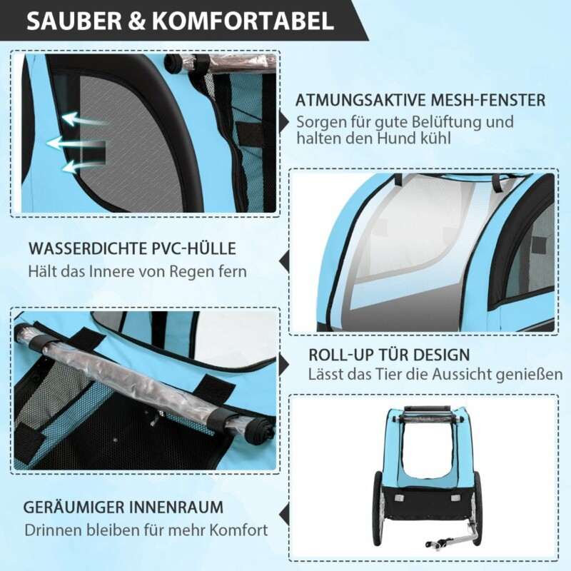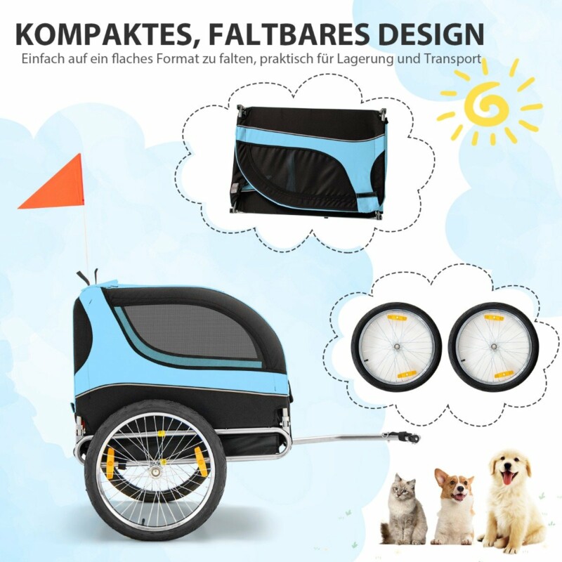 Ταξιδέψτε με το όμορφο κατοικίδιό σας! Το τρέιλερ ποδηλάτου για κατοικίδια μετρά 77,5 εκ. x 40,5 εκ. x 67 εκ. (Μ x Π x Υ) και μπορεί να μεταφέρει έως 40 κιλά, καθιστώντας το κατάλληλο για τη μεταφορά μικρών και μεσαίων κατοικίδιων. Κατασκευασμένο από ανθεκτικό ύφασμα Oxford και σταθερό ατσάλινο πλαίσιο, το αναδιπλούμενο κουτί μεταφοράς για σκύλους είναι σχεδιασμένο για μακροχρόνια χρήση σε εξωτερικούς χώρους. Για να εξασφαλιστεί η ασφάλεια, το τρέιλερ ποδηλάτου είναι εξοπλισμένο με κόκκινη σημαία και 8 ανακλαστήρες για βελτίωση της ορατότητας και προστατευτικό κάλυμμα για να προστατεύει τον τετράποδο φίλο σας από κακές καιρικές συνθήκες. Επιπλέον, το κατοικίδιό σας μπορεί να απολαύσει τη δροσερή αύρα και το όμορφο τοπίο με 2 πόρτες, ένα ευρύχωρο σκέπαστρο και 2 παράθυρα με δίχτυ όταν βρίσκεστε στο δρόμο. Μπορεί επίσης να διπλωθεί όταν δεν χρησιμοποιείται. Με αυτό το τρέιλερ κατοικίδιων, το κατοικίδιό σας μπορεί να απολαύσει το ταξίδι μαζί σας, ενώ εσείς αισθάνεστε πιο άνετα και βολικά. (Σημείωση: Παρακαλώ μετρήστε το μήκος, το πλάτος των ώμων και το βάρος του κατοικίδιου σας πριν αγοράσετε αυτό το προϊόν.)