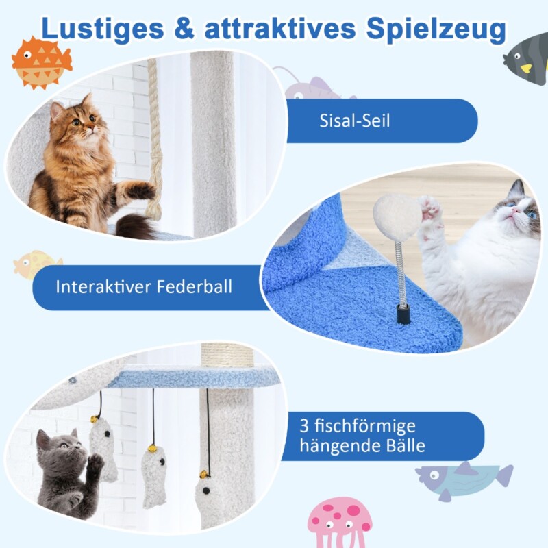 - Πολυλειτουργικό κέντρο παιχνιδιού: Το δέντρο γάτας με θέμα τη θάλασσα είναι εξοπλισμένο με μια ποικιλία διαδραστικών παιχνιδιών, από το δελεαστικό σχοινί σιζάλ μέχρι μπάλες ξυσίματος και ψαριών που ξυπνούν το ένστικτο κυνηγιού τους. Η μπάλα με φτερά προσφέρει επιπλέον διασκέδαση.