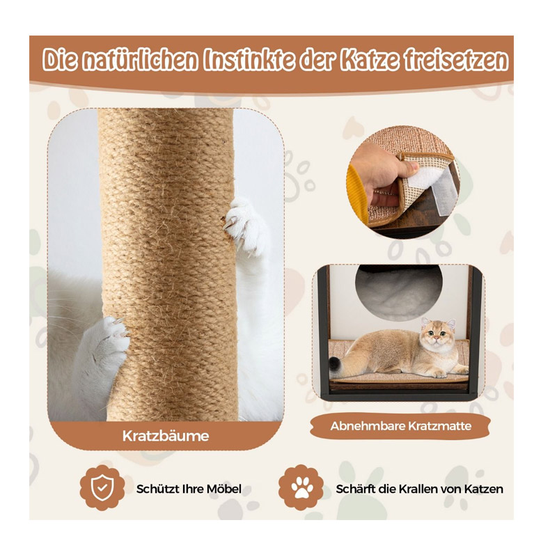 Το έπιπλο γάτας, από την εταιρία Costway, διαθέτει μασίφ μεταλλικό σκελετό και υψηλής ποιότητας MDF με ανάγλυφο κόκκο ξύλου. Εξοπλισμένο με χαλάκι και στύλο από σχοινί γιούτα για το ξύσιμο των νυχιών, 2 ξύλινα ράφια και 1 σπιτάκι με μαξιλάρι το οποίο μπορεί εύκολα να αφαιρεθεί και να πλυθεί.