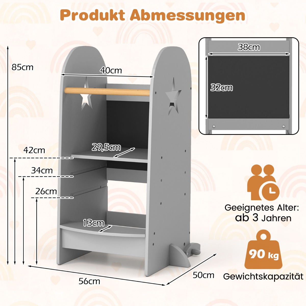 Με τον πύργο μας, το παιδί σας αποκτά πρόσβαση σε υψηλότερα σημεία για διάφορες δραστηριότητες! Είναι η ιδανική επιλογή για να βοηθήσετε παιδιά από 3 ετών στο πλύσιμο χεριών, την προετοιμασία φαγητού ή το βούρτσισμα των δοντιών. Ο παιδικός σκαλοπάτι μπορεί επίσης να χρησιμοποιηθεί ως καβαλέτο τέχνης με διπλής όψης πίνακα. Οι 3 επιλογές ύψους τον καθιστούν ιδανικό για παιδιά διαφορετικού μεγέθους. Για την ασφάλεια των παιδιών, είναι εξοπλισμένος με τετράπλευρο προστατευτικό κιγκλίδωμα και ευρύχωρη πλατφόρμα. Επιπλέον, οι στρογγυλεμένες γωνίες και οι επιφάνειες χωρίς θραύσματα προσφέρουν εξαιρετική ασφάλεια. Με τη δομή σε σχήμα Α, τα αντιολισθητικά πόδια και τα μαξιλαράκια, ο πύργος παραμένει σταθερός και ασφαλής. Τα παιδιά μπορούν να τον χρησιμοποιήσουν στην κουζίνα, το σαλόνι, το δωμάτιο παιχνιδιού ή το μπάνιο.