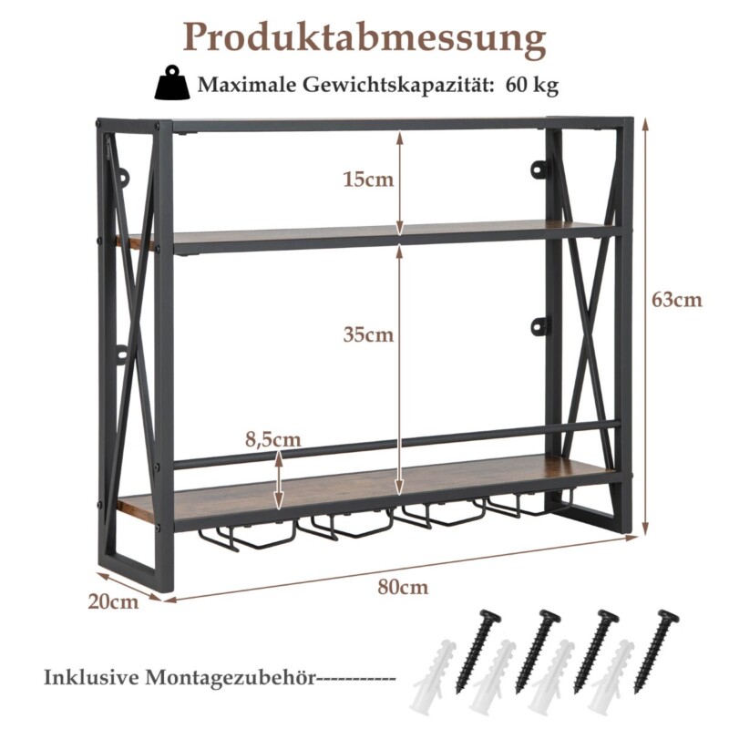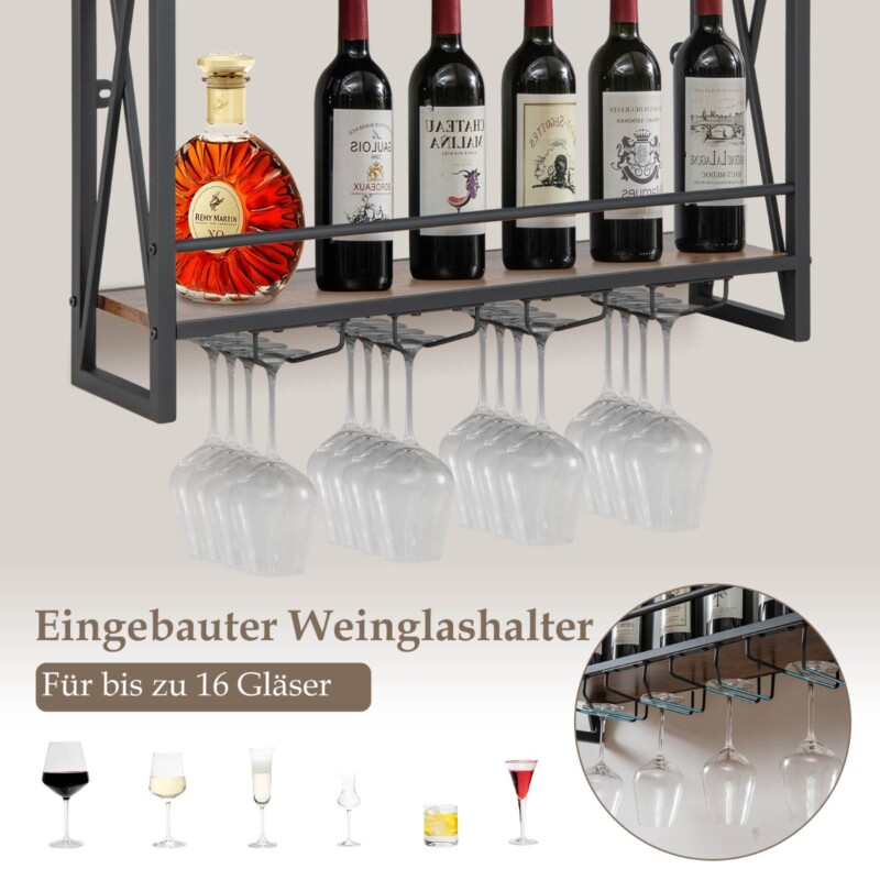 Εξοικονομήστε χώρο και ενισχύστε τη διακόσμηση του σπιτιού σας με αυτό το 3-επίπεδο ράφι κρασιού τοίχου, κατασκευασμένο από επιλεγμένα υλικά και στιβαρούς μεταλλικούς σωλήνες. Το ράφι κρασιού με θήκη ποτηριών προσφέρει αντοχή και θα το απολαμβάνετε για πολύ καιρό.