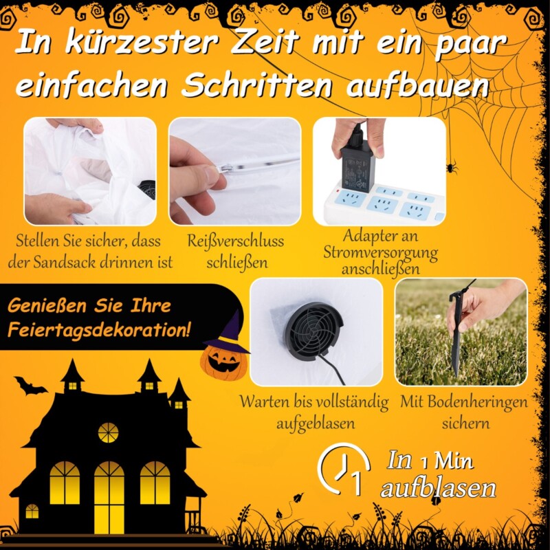 • Εύκολη εγκατάσταση: Η απλή διακόσμηση του Halloween μπορεί να τοποθετηθεί στον κήπο μέσα σε λίγα λεπτά, ιδανική για προετοιμασίες της τελευταίας στιγμής. Ρυθμίστε τη διακόσμηση των διακοπών σας με αυτά τα απλά βήματα: Βεβαιωθείτε ότι η σακούλα άμμου είναι μέσα, κλείστε το φερμουάρ στο κάτω μέρος και συνδέστε τον προσαρμογέα στην παροχή ρεύματος. Περιμένετε περίπου 1 λεπτό για να φουσκώσει πλήρως το φάντασμα.