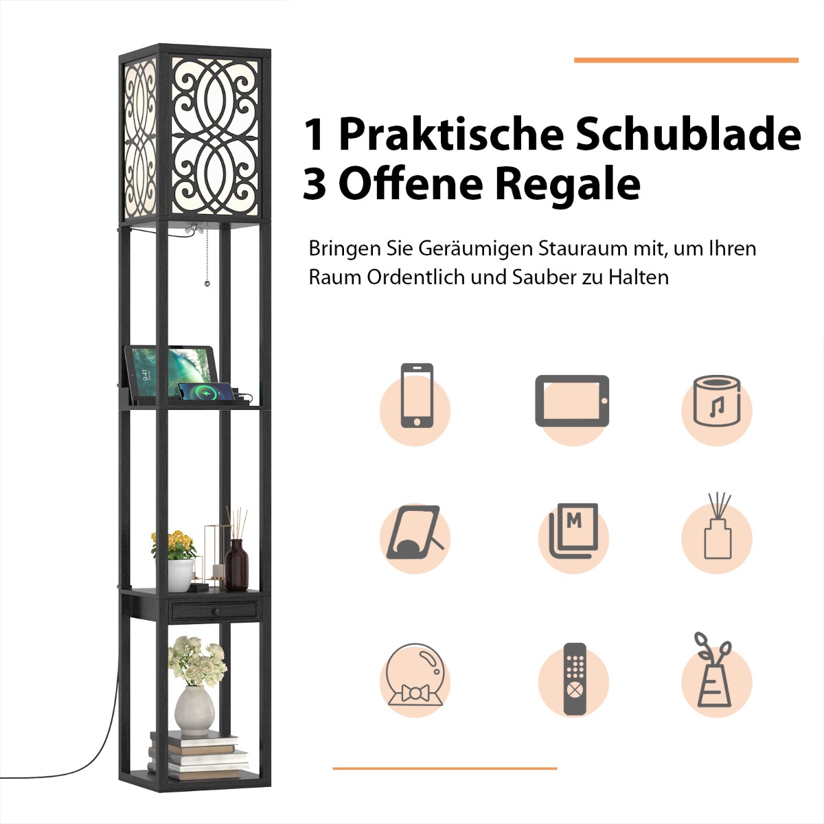 Χάρη στην όρθια μορφή της, μπορεί να τοποθετηθεί υπέροχα σε γωνίες υπνοδωματίων ή σαλονιών. Επιπλέον, μέσω δύο θυρών USB, μπορούν να φορτιστούν ηλεκτρικές συσκευές. Με την αλυσίδα έλξης μπορείτε να ανάψετε και να σβήσετε εύκολα τη λάμπα. Με το συρτάρι και τα 3 ράφια της, σας προσφέρει πρακτικό αποθηκευτικό χώρο.