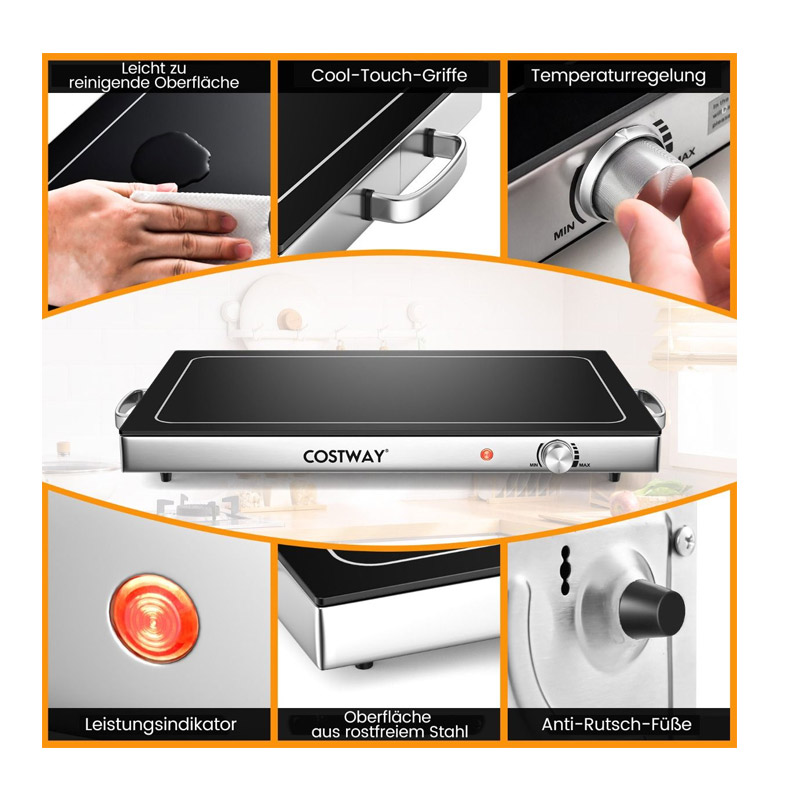 Η επιφάνεια του δίσκου, είναι κατασκευασμένη από ανθεκτικό σε υψηλή θερμοκρασία γυαλί, σύρμα θέρμανσης και πλάκα από ανοξείδωτο ατσάλι για μεγάλη διάρκεια ζωής. Η ενδεικτική λυχνία λειτουργίας υποδεικνύει τον τρόπο λειτουργίας της συσκευής. Η ανθεκτική στη θερμοκρασία γυάλινη επιφάνεια μπορεί να χρησιμοποιηθεί με διάφορα μαγειρικά σκεύη, όπως γυάλινες τσαγιέρες ανθεκτικές στη θερμότητα, μαγειρικά σκεύη από αλουμίνιο, μαγειρικά σκεύη από ανοξείδωτο χάλυβα ή κεραμικά σκεύη. Επιπλέον, η επιφάνεια που καθαρίζεται εύκολα κάνει τον καθαρισμό και τη συντήρηση παιχνιδάκι.