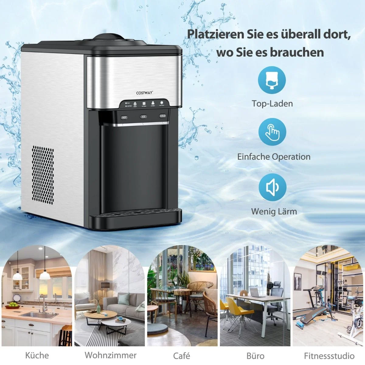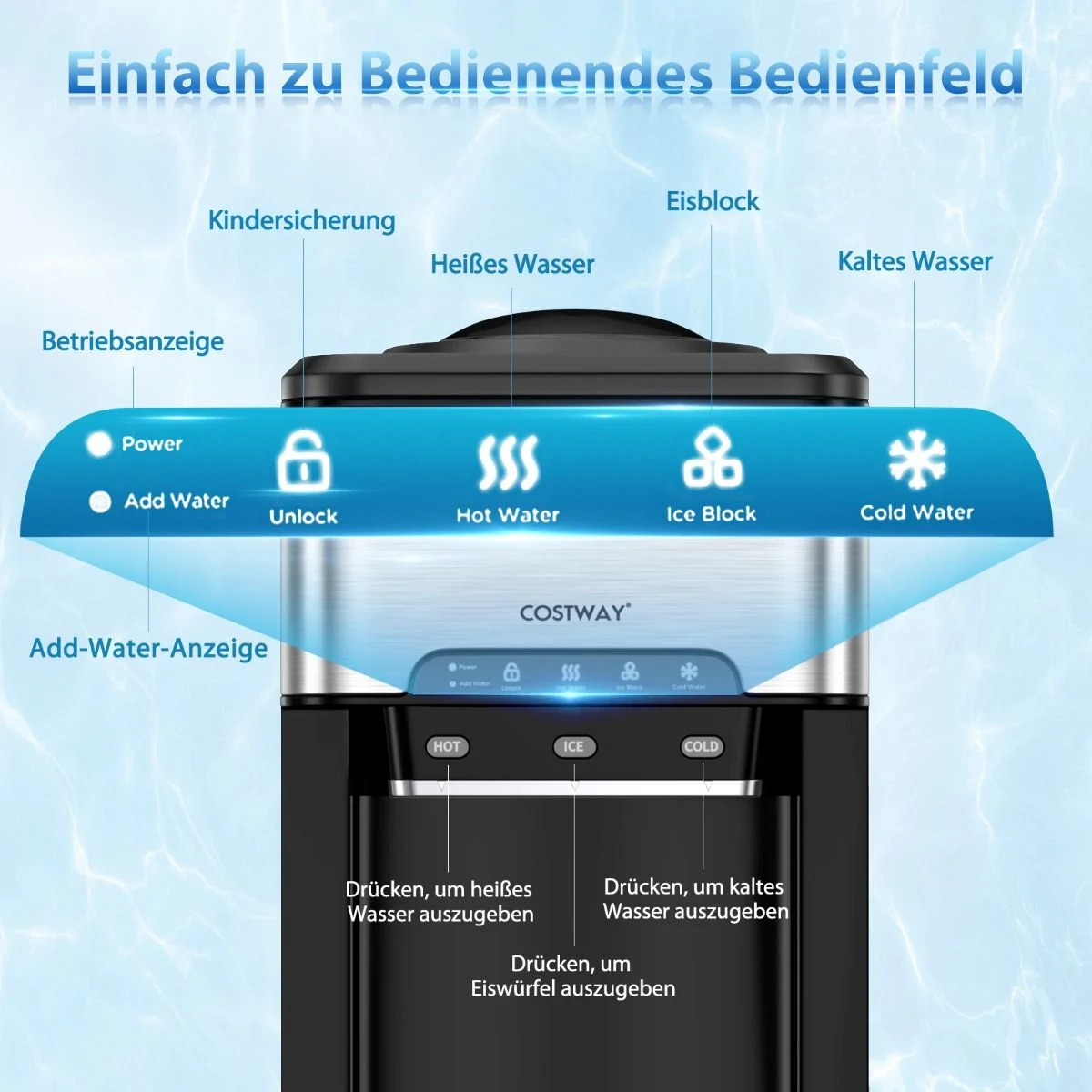 Ο 3-σε-1 ψύκτης νερού με ενσωματωμένη παγομηχανή είναι ιδανικός για χρήση σε σπίτια, γραφεία, γυμναστήρια και φοιτητικές εστίες. Προσφέρει τρεις ρυθμίσεις θερμοκρασίας (ζεστό, κρύο και παγωμένο νερό), επιτρέποντάς σας να απολαμβάνετε δροσερά ποτά το καλοκαίρι και ζεστά ροφήματα το χειμώνα. Η συσκευή μπορεί να παράγει 12 σφαιρικά παγάκια ανά κύκλο μέσα σε 6-13 λεπτά, ενώ διαθέτει παιδική ασφάλεια για επιπλέον προστασία.