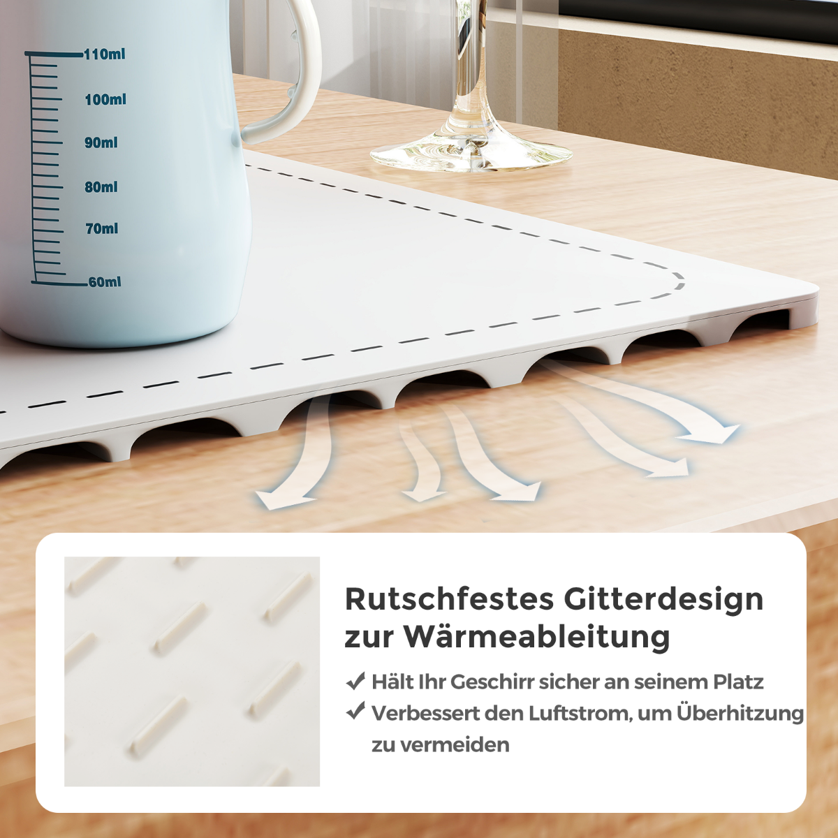 Σημείωση: Σχεδιασμένο για χρήση σε επιφάνειες ανθεκτικές στη θερμότητα, όπως ατσάλι, στερεό ξύλο ή πλακάκια, δεν πρέπει ποτέ να τοποθετηθεί απευθείας σε επιφάνειες ευαίσθητες στη θερμότητα, όπως μάρμαρο, γρανίτη, χαλαζία, σκληρυμένο γυαλί ή Corian. Για επιπλέον ασφάλεια προτείνουμε πάντα τη χρήση ενός ανθεκτικού στη θερμότητα υπόβαθρου (δεν περιλαμβάνεται) κάτω από το χαλάκι, ακόμη και σε εγκεκριμένες επιφάνειες.