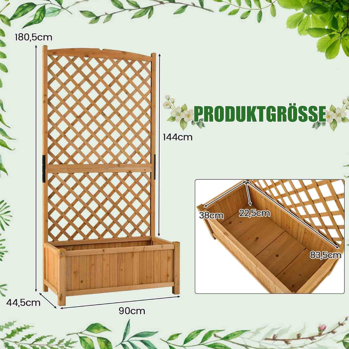 Δώστε στο χώρο σας μια πινελιά κομψής γοητείας! Το υπερυψωμένο κρεβάτι μας μετρά 90 x 44,5 x 180 cm (Μ x Π x Υ) και προσφέρει μεγάλη καλλιεργητική επιφάνεια για διάφορα φυτά. Το πλέγμα είναι κατάλληλο για αναρριχώμενα φυτά που αναπτύσσονται σε ύψος και μπορείτε επίσης να το διακοσμήσετε με διακοσμητικά ή καλάθια. Ο μεγάλος φυτευτής είναι αρκετά βαθύς για να καλλιεργήσετε λουλούδια, βότανα, λαχανικά, φρούτα και άλλα, καλύπτοντας τις διάφορες ανάγκες σας. Χάρη στον έξυπνο σχεδιασμό αποστράγγισης, δεν χρειάζεται να ανησυχείτε για στάσιμα νερά ή ξηρασία. Επιπλέον, το φυτευτήριο είναι κατασκευασμένο από 100% φυσικό ξύλο έλατου, ανθεκτικό στη παραμόρφωση, στις καιρικές συνθήκες και ανθεκτικό, καθιστώντας αυτό το κρεβάτι κήπου την τέλεια επιλογή για κάθε κηπουρική σε εσωτερικούς και εξωτερικούς χώρους. Μπορείτε να το τοποθετήσετε στον κήπο, στη βεράντα, στο μπαλκόνι και να δώσετε στο χώρο σας μια πινελιά φύσης και ζωντάνιας.