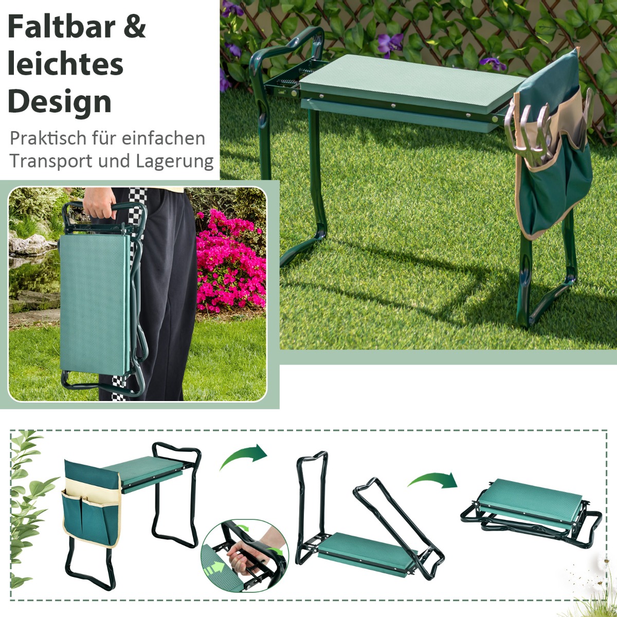 Costway Πτυσσόμενο Γόνατο Κήπου με EVE Μαξιλάρι & Τσάντα Εργαλείων Πράσινο GT4074
