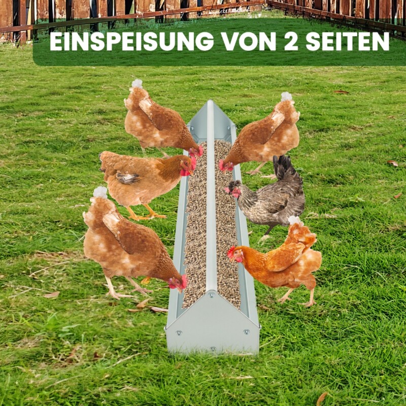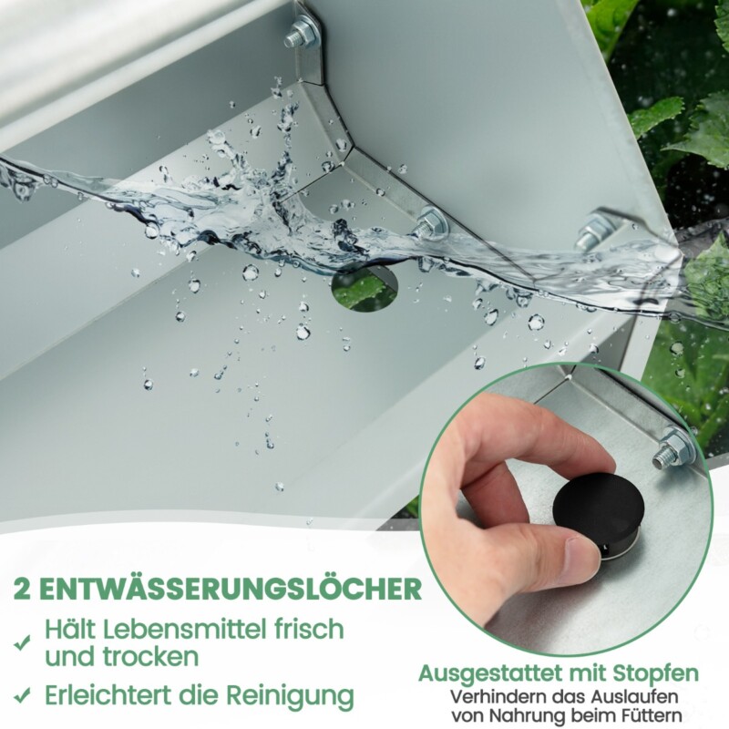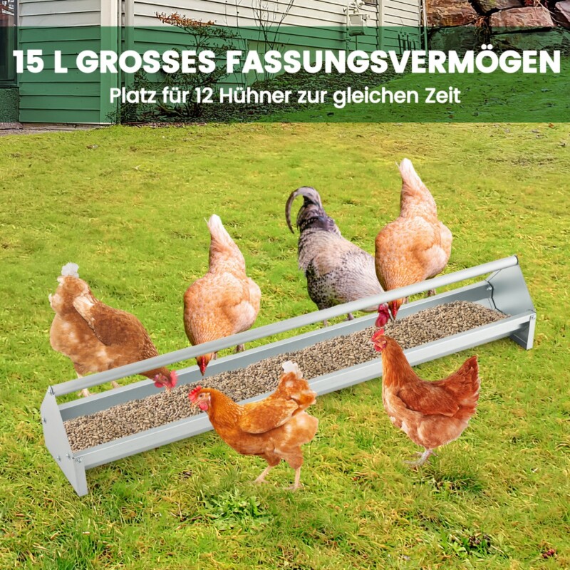 Επιλέξτε την μεταλλική ταΐστρα κοτόπουλων μας και βελτιώστε τη ρουτίνα φροντίδας των πουλερικών σας. Η ταΐστρα μας με μεγάλη χωρητικότητα επιτρέπει τη σίτιση από δύο πλευρές, ώστε 12 κοτόπουλα να τρώνε ταυτόχρονα. Χάρη στον σχεδιασμό με διπλωμένες άκρες, τα κοτόπουλα είναι λιγότερο επιρρεπή σε τραυματισμούς. Επιπλέον, η περιστρεφόμενη ράβδος αποτρέπει τα πουλιά από το να πατούν πάνω της. Εξοπλισμένη με δύο οπές αποστράγγισης, το υπερβολικό νερό απομακρύνεται, διατηρώντας την τροφή φρέσκια και στεγνή. Οι δύο τάπες εξασφαλίζουν ότι δεν υπάρχει σπατάλη και ακαταστασία κατά τη σίτιση των κοτόπουλων σας. Ο δοχείο τροφής από γαλβανισμένο μέταλλο είναι αδιάβροχος και ανθεκτικός σε ρωγμές, αντέχοντας στη δοκιμασία του χρόνου. Σε σύγκριση με τα πλαστικά υλικά, το μέταλλο έχει μεγαλύτερο βάρος και δεν σπάει εύκολα. Η τραπεζοειδής δομή προσφέρει απαράμιλλη σταθερότητα. Η μακριά ράβδος λειτουργεί ως πρακτική λαβή και αποτρέπει τα πουλιά από το να πατούν πάνω της. Εκτός από κοτόπουλα, αυτός ο διανομέας σιτηρών μπορεί να χρησιμοποιηθεί και για περιστέρια, πάπιες και άλλα πουλερικά.