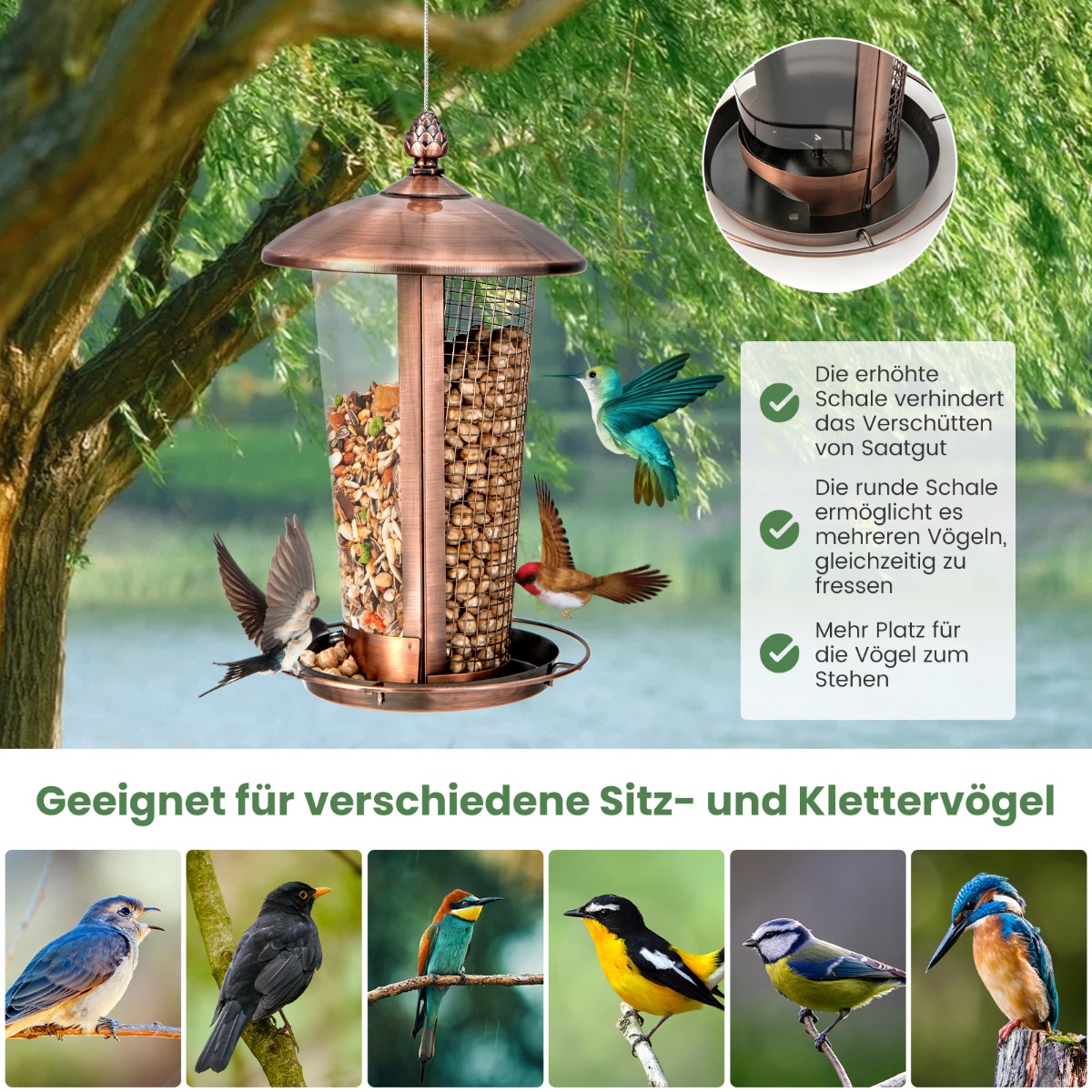 Τέλειο δώρο για άγρια πουλιά! Το 2-σε-1 κρεμαστό ταΐστρα πουλιών για εξωτερικούς χώρους έρχεται με 2 σωλήνες που μπορούν να φιλοξενήσουν σπόρους διαφορετικού μεγέθους, προσελκύοντας πουλιά όπως καρδινάλια, κοροϊδευτικά, τσίχλες, σπίνους, κ.λπ. Είναι κατασκευασμένο από υψηλής αντοχής, ψεκασμένο μέταλλο και χρησιμοποιεί ανοξείδωτο σύρμα, καθιστώντας το κατάλληλο για χρήση σε διάφορες καιρικές συνθήκες. Με το ανυψωμένο στρογγυλό δίσκο, πολλά πουλιά μπορούν να απολαύσουν το φαγητό τους ταυτόχρονα. Όταν αδειάσει, απλά ανοίξτε το καπάκι και γεμίστε με νέους σπόρους. Μπορείτε να το κρεμάσετε σε δέντρο, στέγη ή κολόνα ανάλογα με τις ανάγκες σας.