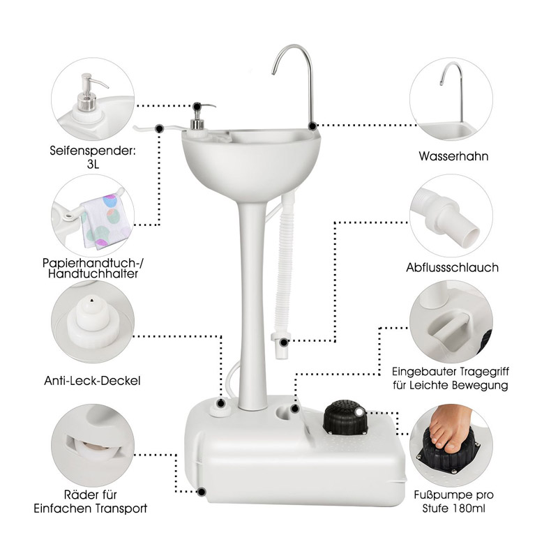 Επιπλέον, διαθέτει λειτουργία hands-free πατώντας την αντλία ποδιού. Κάθε φορά που την πιέζετε, αντλούνται συνεχώς 180 ml νερού. Επιπλέον, είναι εξοπλισμένος με σχάρα για πετσέτες για περισσότερη ευκολία, ενσωματωμένη λαβή μεταφοράς και 4 τροχούς για ελεύθερη κίνηση ακόμα και όταν είναι γεμάτος νερό. Επιπλέον, η δεξαμενή βάσης μπορεί να στερεωθεί με ασφάλεια στο πάτωμα μέσω τεσσάρων οπών στη γωνία. Και με συγκεκριμένες οδηγίες και απαιτούμενα εξαρτήματα, συναρμολογείται εύκολα.