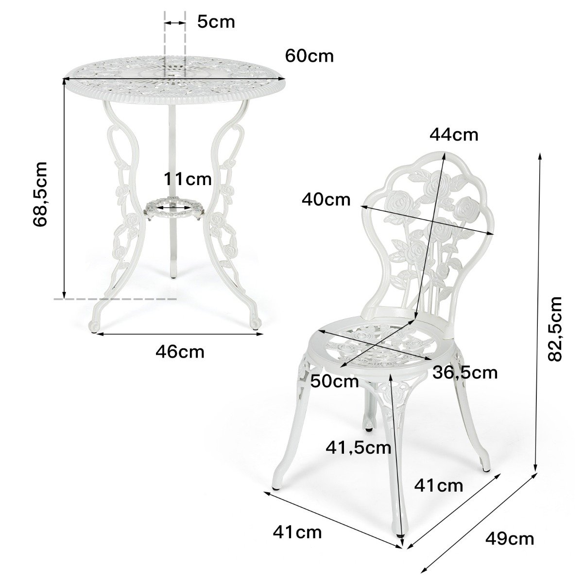 - Στερεή Κατασκευή από Χυτοπρεσαριστό Σίδηρο και Αλουμίνιο: Κατασκευασμένο από χυτοπρεσαριστό αλουμίνιο και χυτοπρεσαριστό σίδηρο, αυτό το 3-κομμάτι σετ μπιστρό είναι ανθεκτικό και σταθερό για μακροχρόνια χρήση.