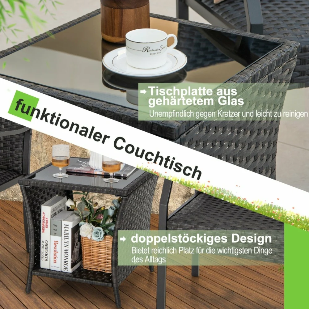 - Ανθεκτικό υλικό: Νιώστε ήσυχοι γνωρίζοντας ότι το σετ βεράντας είναι κατασκευασμένο από ανθεκτικό PE-Rattan, σχεδιασμένο να αντέχει στα στοιχεία, επιτρέποντας τη χρήση σε εξωτερικούς χώρους όλο το χρόνο χωρίς να θυσιάζεται το στυλ. Ο ανθεκτικός μεταλλικός σκελετός προσφέρει επίσης αδιάκοπη σταθερότητα και αξιόπιστη υποστήριξη.