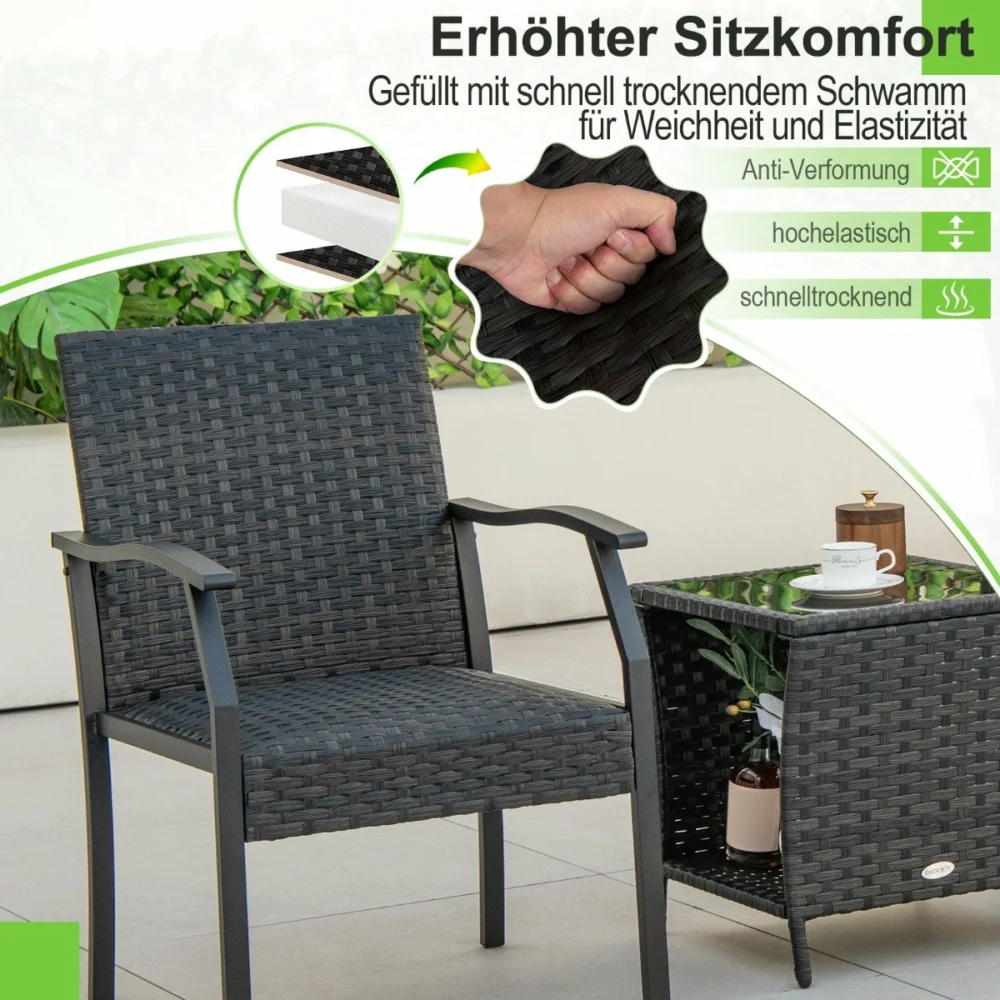 Οι δύο καρέκλες αυτού του σετ βεράντας προσφέρουν αυξημένη άνεση καθίσματος και είναι γεμισμένες με αφρό που στεγνώνει γρήγορα, καθιστώντας τις μαλακές και ελαστικές. Αυτό επιτρέπει μια άνετη εμπειρία καθίσματος που μπορείτε να απολαύσετε για μεγάλο χρονικό διάστημα σε εξωτερικούς χώρους. Το σετ περιλαμβάνει επίσης ένα λειτουργικό τραπεζάκι καφέ με δίχωρο σχεδιασμό, που προσφέρει αρκετό χώρο για σνακ, ποτά και βιβλία. Το τραπέζι, κατασκευασμένο από ανθεκτικό σκληρό γυαλί, είναι ανθεκτικό στις γρατσουνιές και εύκολο στον καθαρισμό. Επιπλέον, το PE-Rattan δεν είναι μόνο κομψό, αλλά και ανθεκτικό στο φως, καθιστώντας το κατάλληλο για μακροχρόνια χρήση. Το σετ βεράντας είναι κατάλληλο για διάφορα περιβάλλοντα, είτε στην πισίνα, στην αυλή, στον κήπο ή ακόμα και στο μπαλκόνι.