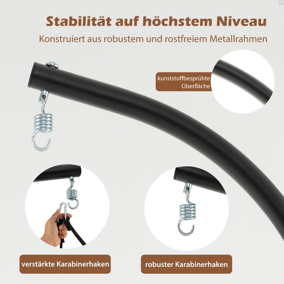 - Ανθεκτική μεταλλική βάση: Η βάση προσφέρει τέλειο σημείο ανάρτησης της καρέκλας και είναι κατασκευασμένη από ανθεκτικό και αντισκωριακό μεταλλικό σκελετό για υψηλή σταθερότητα.