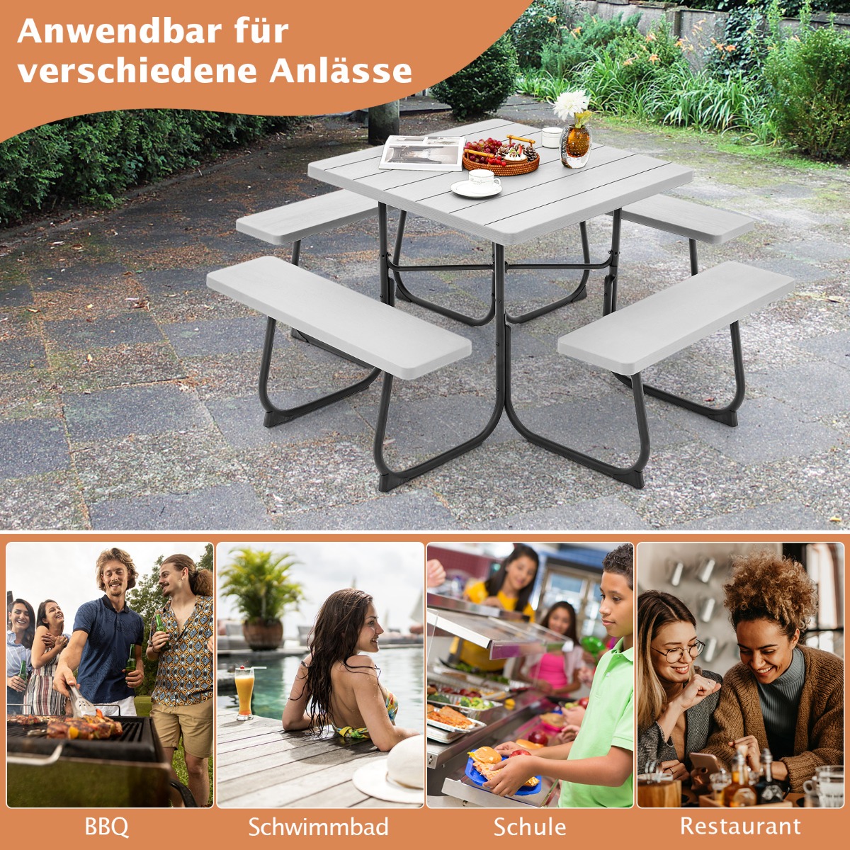 - Ευρεία εφαρμογή: Με ξύλινη εμφάνιση και βελτιωμένη ανθεκτικότητα, το σταθερό τραπέζι πικνίκ ενσωματώνεται άψογα σε κάθε εξωτερικό περιβάλλον, όπως ο κήπος, η αυλή, η περιοχή της πισίνας. Επιπλέον, οι λείες στρογγυλεμένες γωνίες του αποτρέπουν τυχαία χτυπήματα.