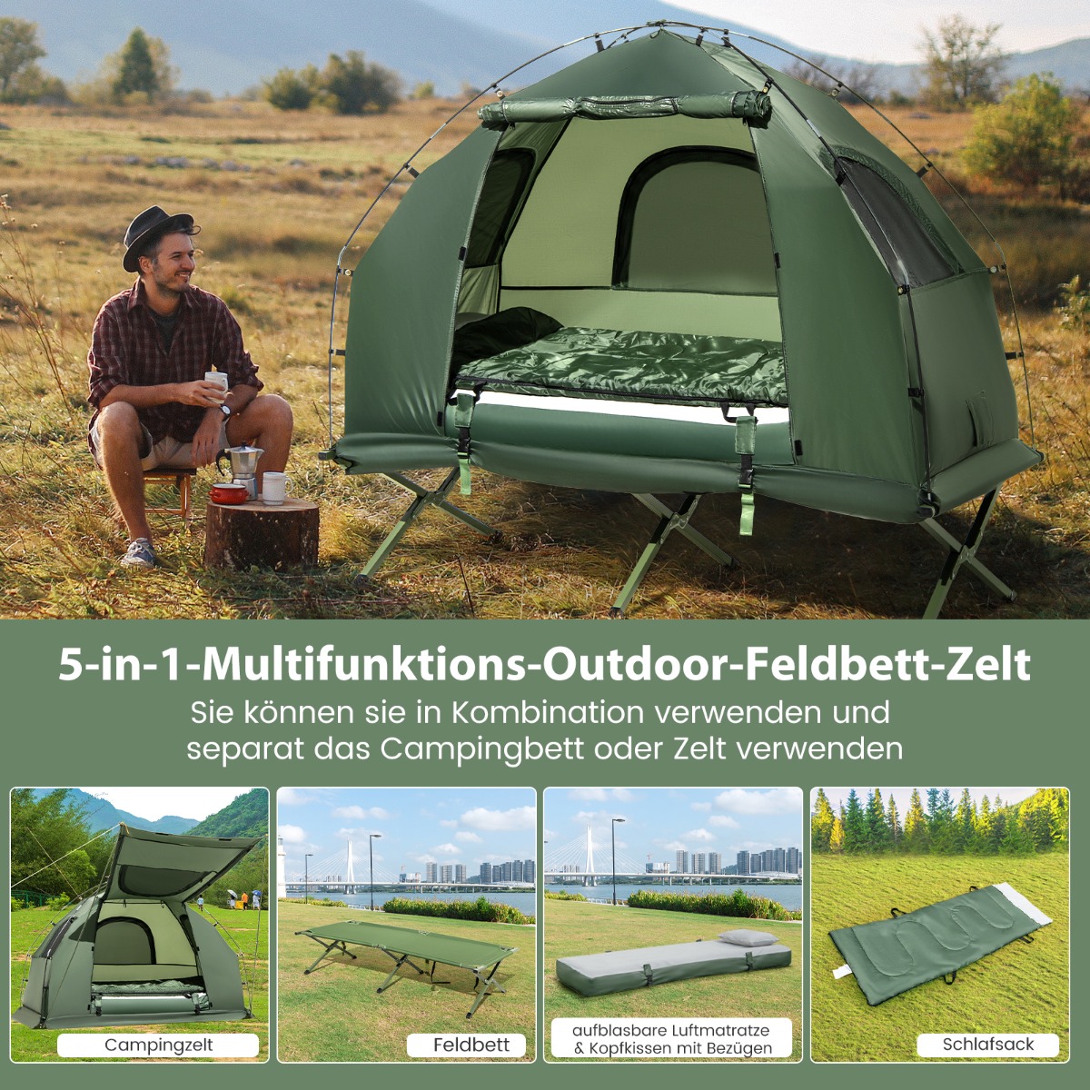 - Πολυλειτουργικό σχέδιο 5-σε-1: Κάμπινγκ-κρεβάτι, σκηνή, υπνόσακος, κλινοσκεπάσματα