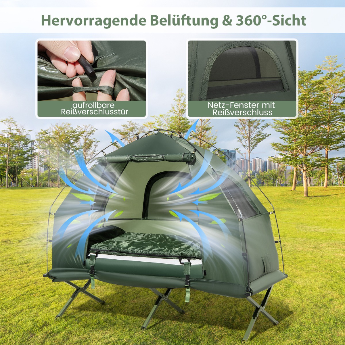 Ένα πολυλειτουργικό κάμπινγκ-κρεβάτι που θα βελτιώσει την εμπειρία σας στην ύπαιθρο! Το πτυσσόμενο κάμπινγκ-κρεβάτι για ένα άτομο περιλαμβάνει ένα κρεβάτι κάμπινγκ, μια σκηνή κάμπινγκ, έναν υπνόσακο, καθώς και ένα στρώμα αέρα και ένα μαξιλάρι με κάλυμμα, και κάθε στοιχείο μπορεί να χρησιμοποιηθεί μεμονωμένα ή σε συνδυασμό για μέγιστη άνεση. Ιδιαίτερα, το στρώμα αέρα μας έχει αναβαθμιστεί και χρησιμοποιεί κατασκευές με σπείρες για αξιόπιστη υποστήριξη για έναν ξεκούραστο ύπνο. Επιπλέον, το κρεβάτι κάμπινγκ είναι κατασκευασμένο από παχύ ύφασμα Oxford με επίστρωση PE και το σκέπαστρο από υψηλής ποιότητας πολυεστερικό ύφασμα, προσφέροντας ιδανική προστασία από τον ήλιο και την ελαφριά βροχή. Χάρη στο ύψος των 43 cm από το έδαφος και το αδιάβροχο κάτω υλικό, το καταφύγιο ύπνου μπορεί να παραμείνει μακριά από υγρή λάσπη και ανεπιθύμητους επισκέπτες. Για να εξασφαλίσουμε σταθερότητα και ασφάλεια, παρέχουμε 12 καρφιά εδάφους και 8 σχοινιά ανέμου για να στερεώσετε τη σκηνή στο έδαφος ή την άμμο. Επιπλέον, διπλώνεται εύκολα, αποθηκεύεται σε μια τσάντα μεταφοράς και ζυγίζει μόνο 13 κιλά, επιτρέποντας εύκολη μεταφορά.