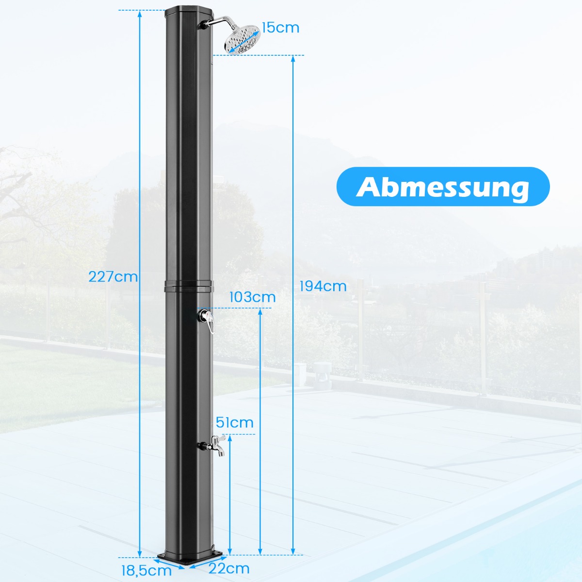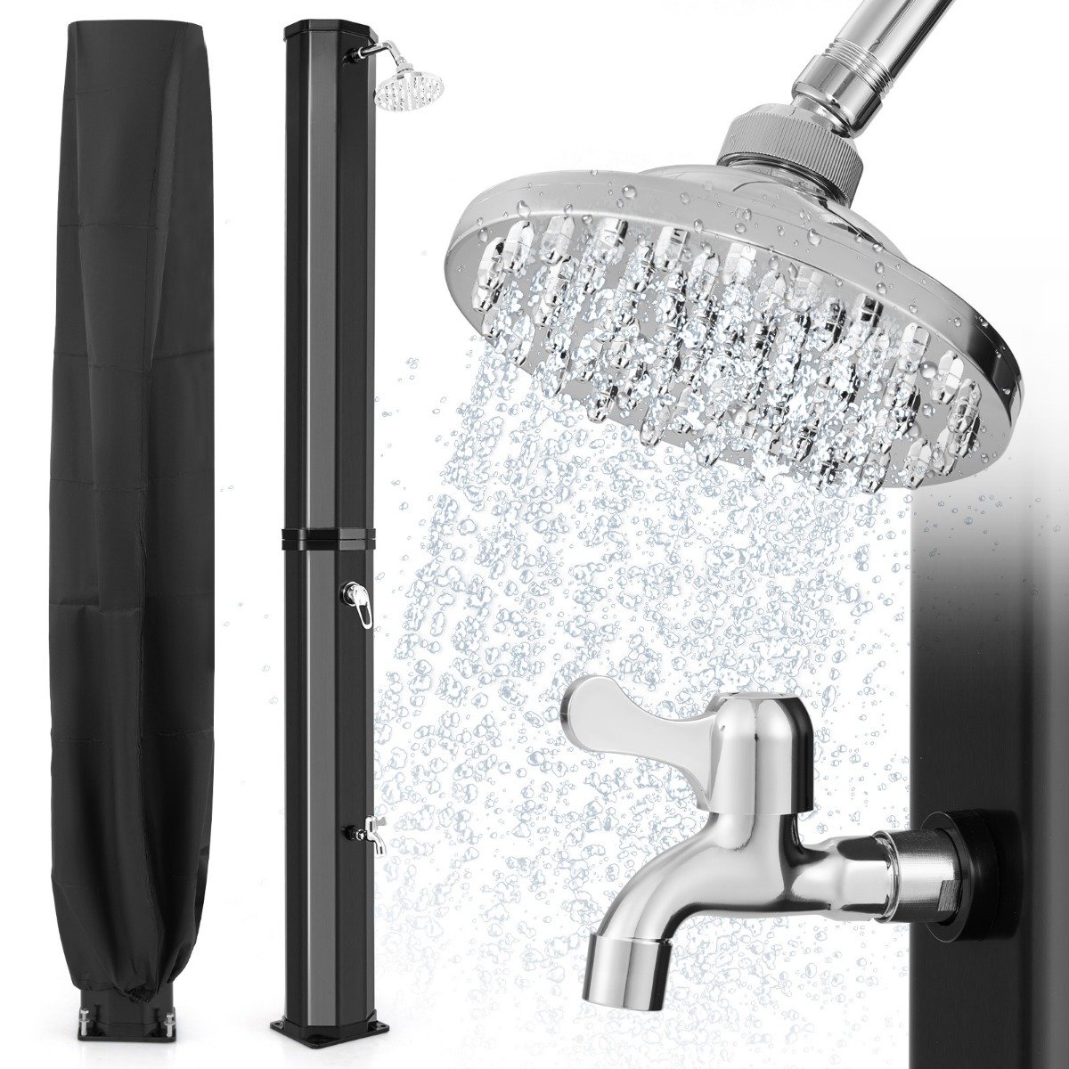 Βελτιώστε την εμπειρία του ντους σας σε εξωτερικούς χώρους με το ηλιακό ντους. Αυτό το ντους πισίνας μπορεί να χρησιμοποιήσει το φυσικό ηλιακό φως για να θερμάνει το νερό έως και 60 °C χωρίς ηλεκτρικό ρεύμα. Το περιστρεφόμενο κατά 360° κεφαλή ντους και το επιπλέον ντους ποδιών προσφέρουν ευελιξία και εύκολο πλύσιμο για όλους τους χρήστες. Κατασκευασμένο από υψηλής ποιότητας PVC και επιχρωμιωμένα υλικά ABS, είναι αρκετά ανθεκτικό για να αντέχει σε διάφορες καιρικές συνθήκες. Επιπλέον, το παρεχόμενο κάλυμμα την προστατεύει όταν δεν χρησιμοποιείται.