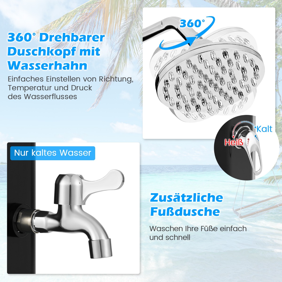 Καλοφτιαγμένες λεπτομέρειες: Αυτό το ηλιακό ντους εξωτερικού χώρου είναι κατασκευασμένο από υψηλής ποιότητας PVC και επιχρωμιωμένα υλικά ABS, προσφέροντας αντοχή και στυλ. Ο ανθεκτικός σχεδιασμός αντέχει σε διάφορες καιρικές συνθήκες και υπόσχεται μακροχρόνια χρήση σε εξωτερικούς χώρους.