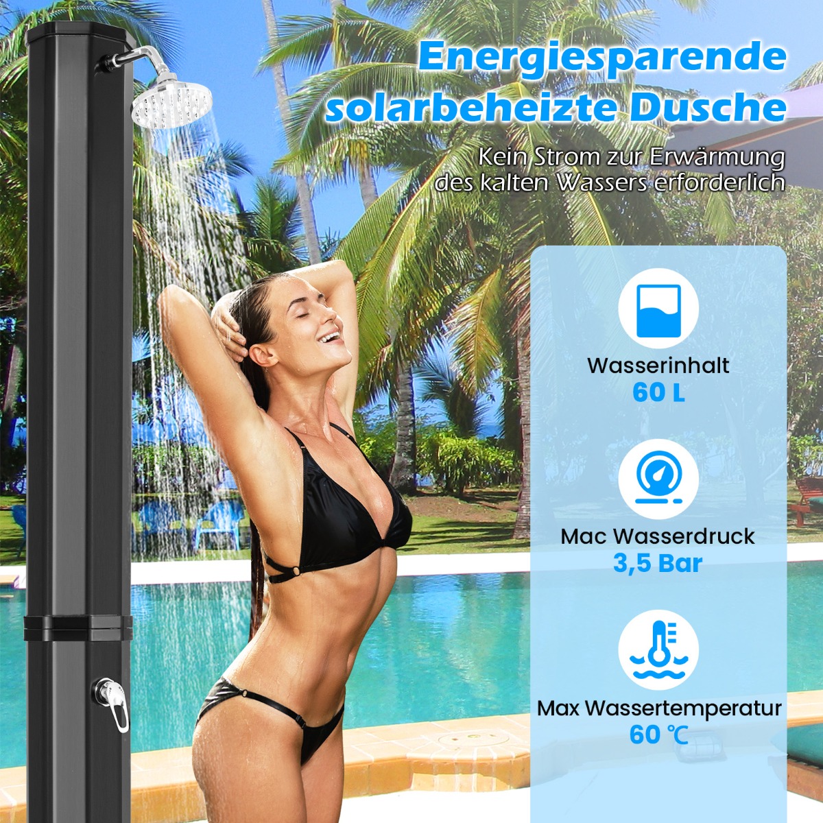 Ηλιακό ντους εξωτερικού χώρου: Αυτό το ενεργειακά αποδοτικό, ηλιακό ντους 60 λίτρων μπορεί να χρησιμοποιήσει τη δύναμη του ήλιου για να θερμάνει το νερό φυσικά, χωρίς να απαιτείται ηλεκτρικό ρεύμα για τη θέρμανση του κρύου νερού. Η ευρύχωρη δεξαμενή χωρά αρκετό νερό για πολλά ντους, καθιστώντας το ιδανικό για χρήση με την οικογένεια ή μετά από ομαδικές δραστηριότητες.