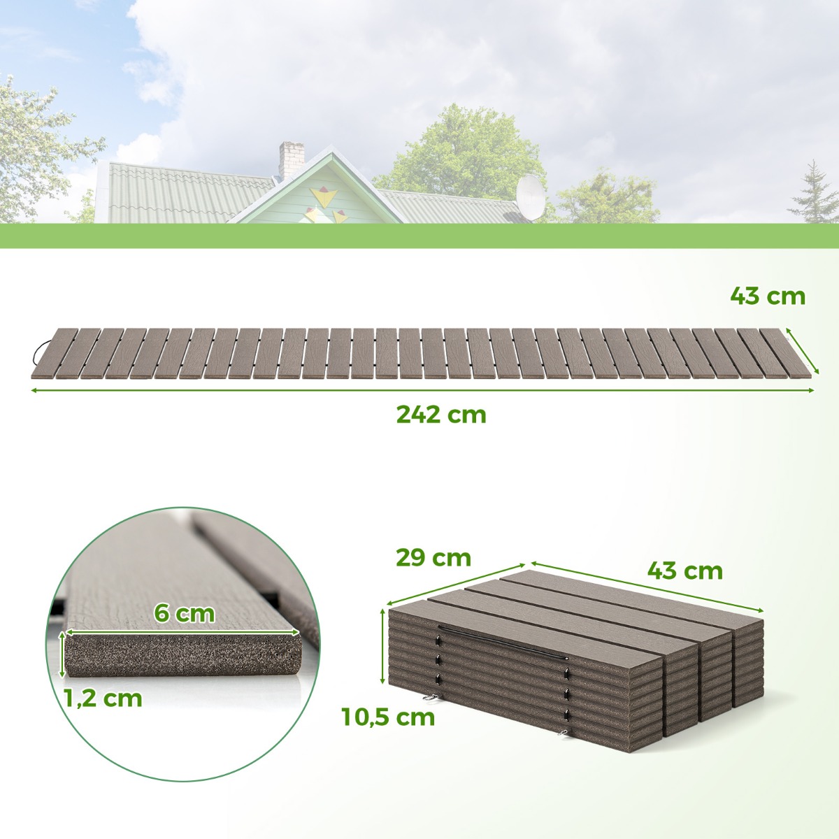 - Πολυλειτουργική εφαρμογή: Με ρεαλιστική υφή ξύλου, ο διάδρομος μήκους 242 cm προσφέρει ευρεία γκάμα εφαρμογών για να ομορφύνετε τους εξωτερικούς σας χώρους. Είτε σχεδιάζετε έναν γάμο, είτε διοργανώνετε μια συνάντηση στην παραλία, είτε δημιουργείτε ένα γοητευτικό τοπίο στον κήπο σας, ο διάδρομος είναι η ιδανική επιλογή.