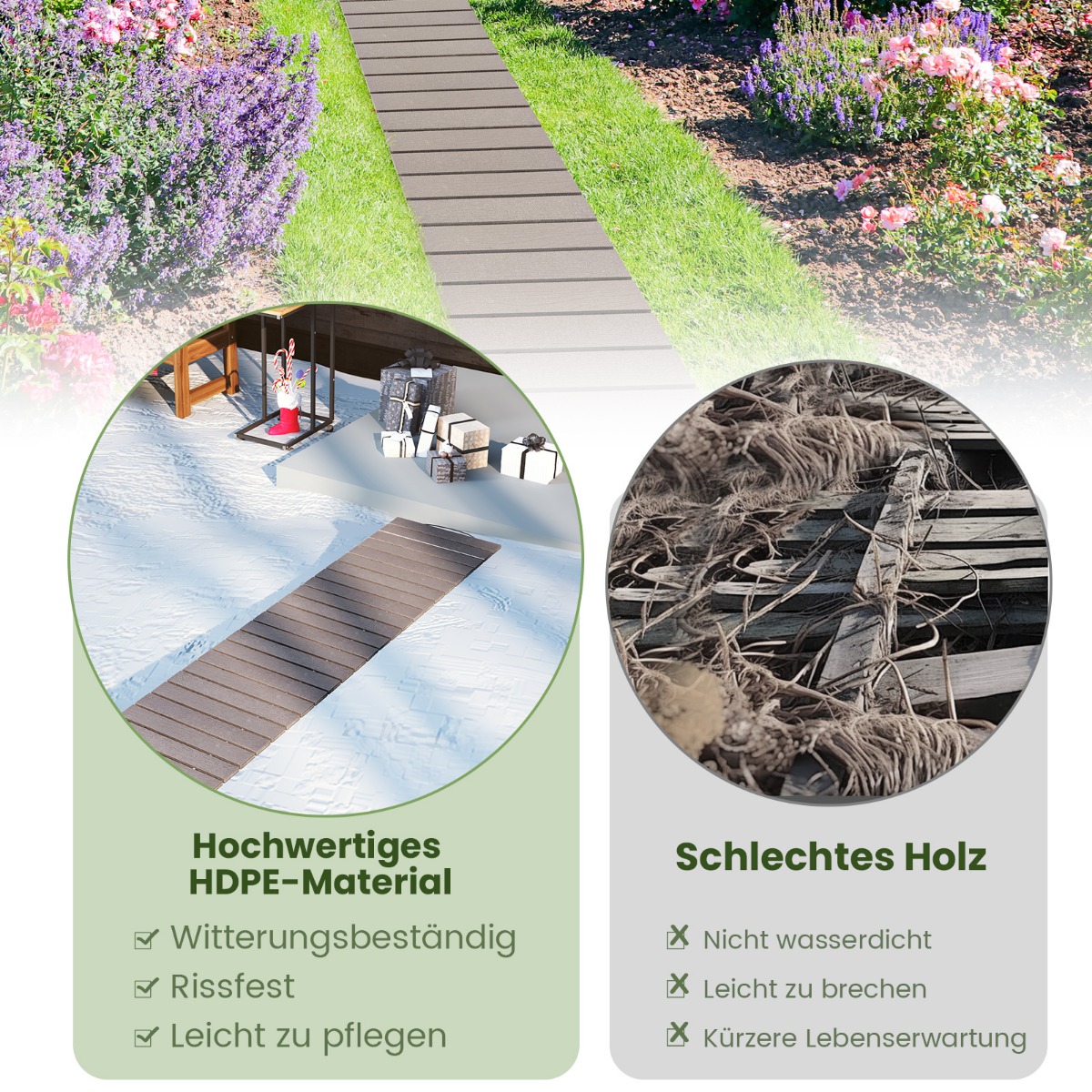 - Σε αντίθεση με το μη αδιάβροχο ξύλο, ο διάδρομος μας είναι κατασκευασμένος από ανθεκτικό στις καιρικές συνθήκες HDPE.