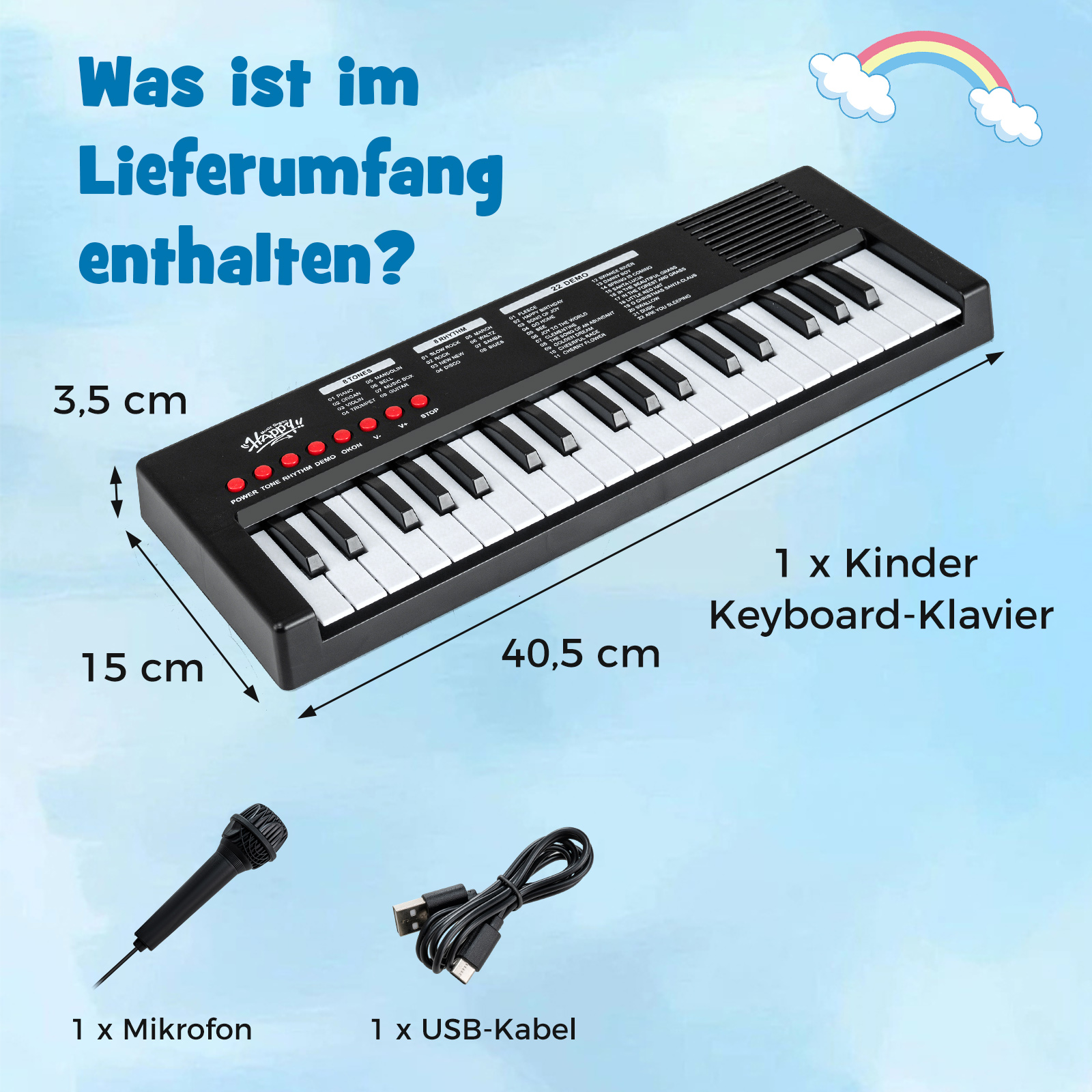 Ανακαλύψτε τον μαγικό κόσμο της μουσικής με το ηλεκτρονικό πληκτρολόγιο με 37 πλήκτρα που προσφέρει πληθώρα από ρυθμούς και ήχους, εμπνέοντας τα παιδιά να αναπτύξουν τις μουσικές και ακουστικές τους ικανότητες.