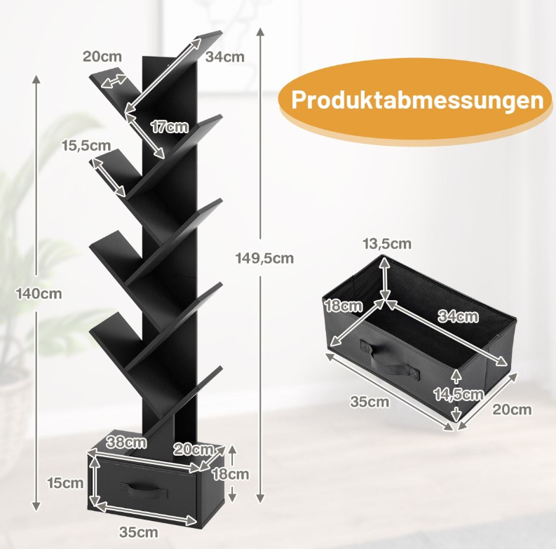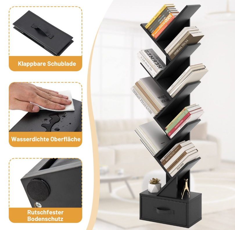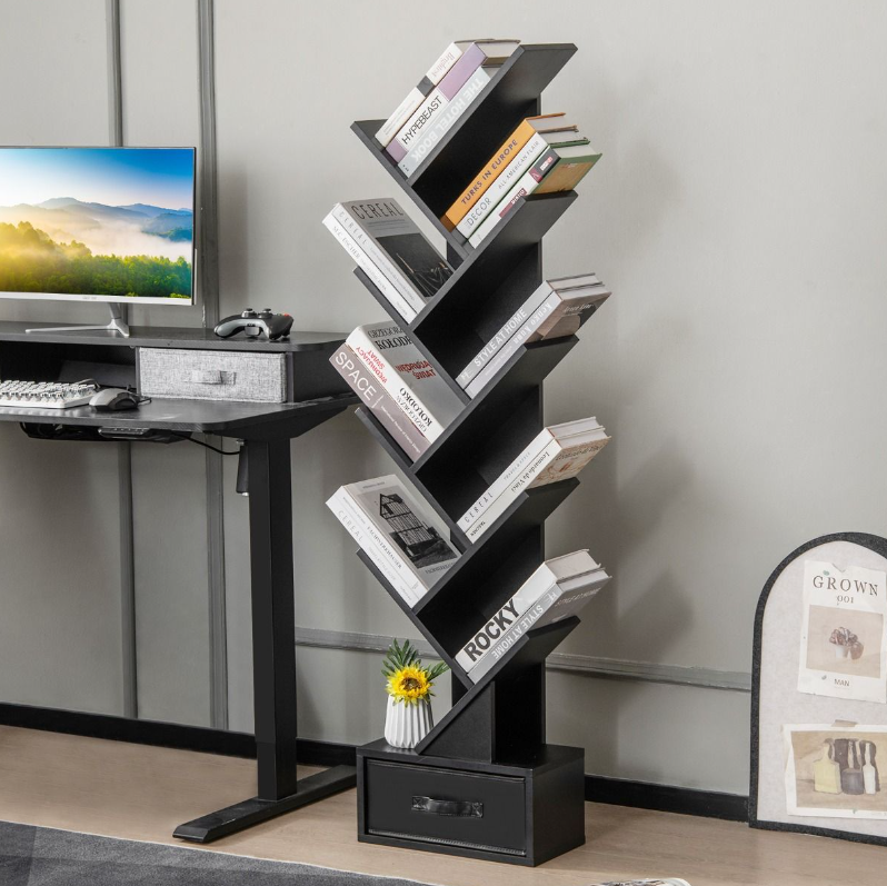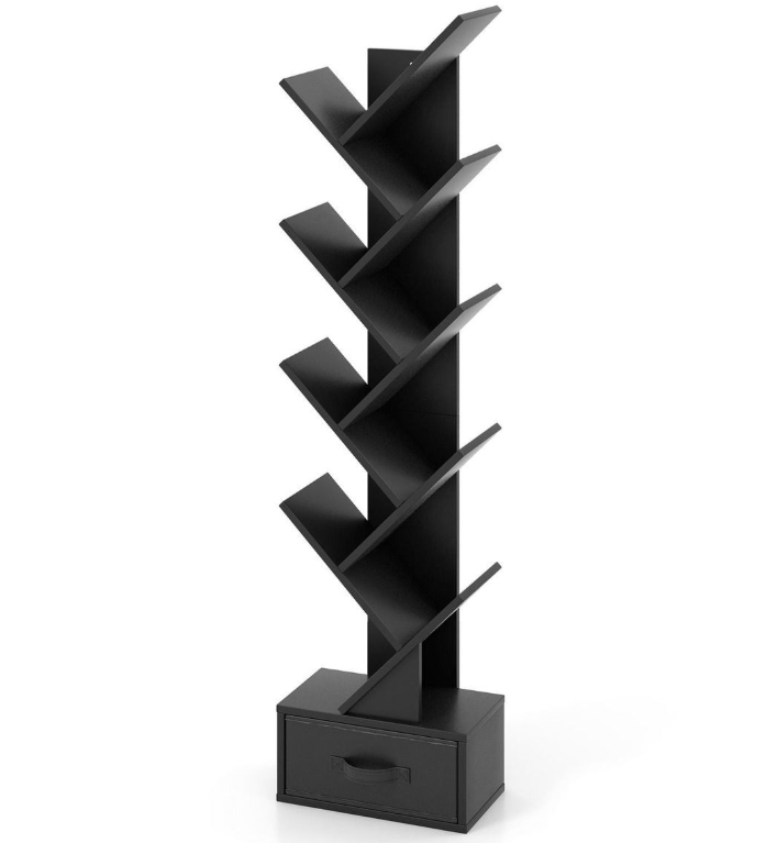 Ξύλινη Επιδαπέδια Ραφιέρα-Βιβλιοθήκη σε Σχήμα Δέντρου 10 Επιπέδων με Συρτάρι Μαύρη CB10372BK Costway