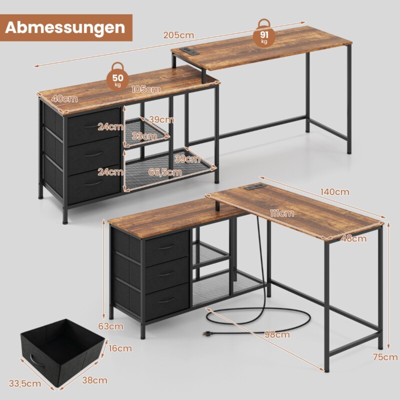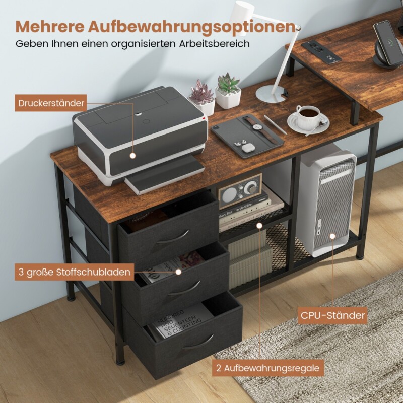 Costway Γραφείο Υπολογιστή σε Σχήμα L με Πρίζα & 3 Υφασμάτινα Συρτάρια & Μεταλλικά Ράφια Καφέ CB10583DE-CF