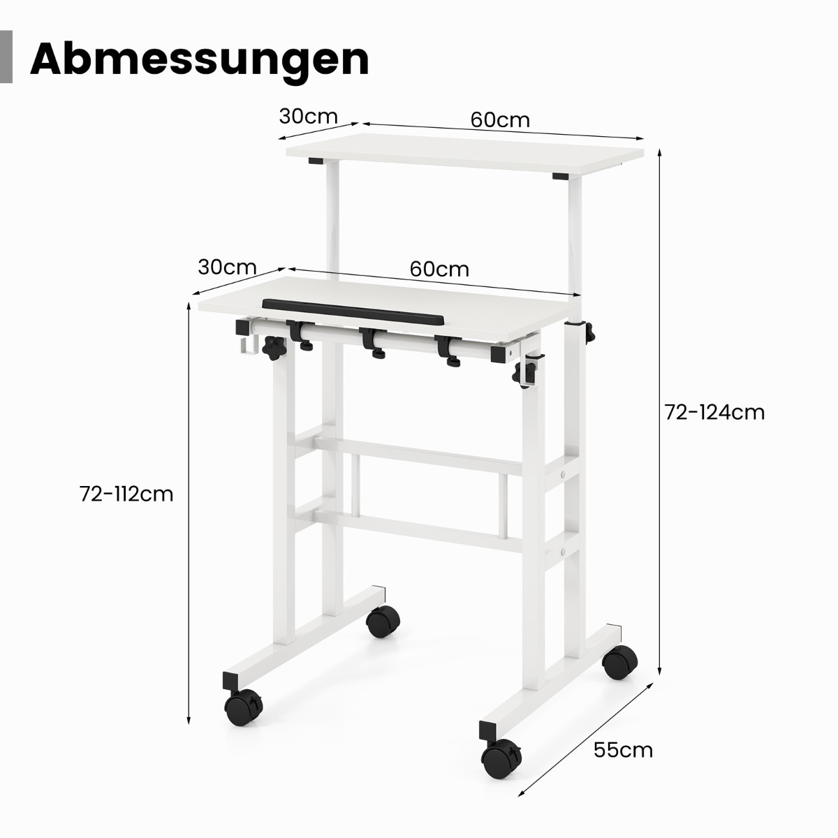 Costway Ρυθμιζόμενο Έπιπλο Γραφείου με Διπλό Επίπεδο και Ρόδες σε Λευκό CB10729WH