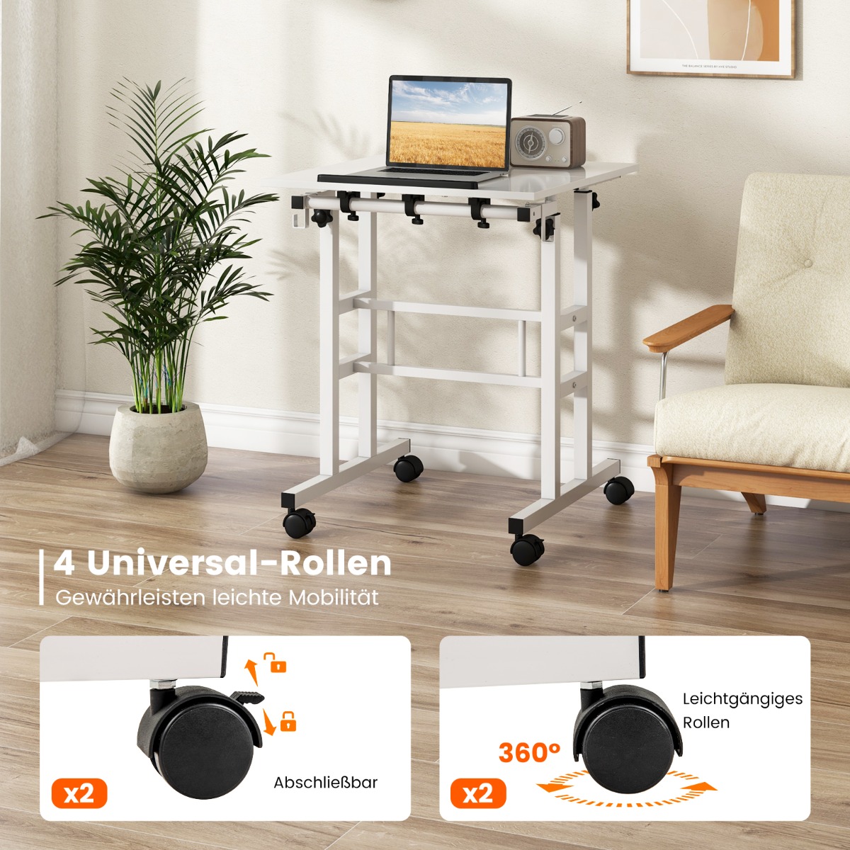 - Εύκολα κυλιόμενοι τροχοί: Οι τέσσερις εύκολοι τροχοί επιτρέπουν το γραφείο να μετακινείται παντού με ευκολία. Είναι περιστρεφόμενοι κατά 360° και κατάλληλοι για όλα τα δάπεδα. Δύο από αυτούς διαθέτουν φρένα για σταθερή τοποθέτηση.