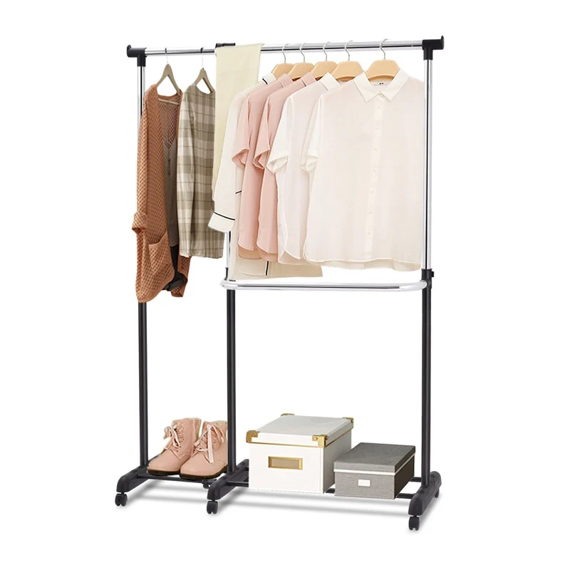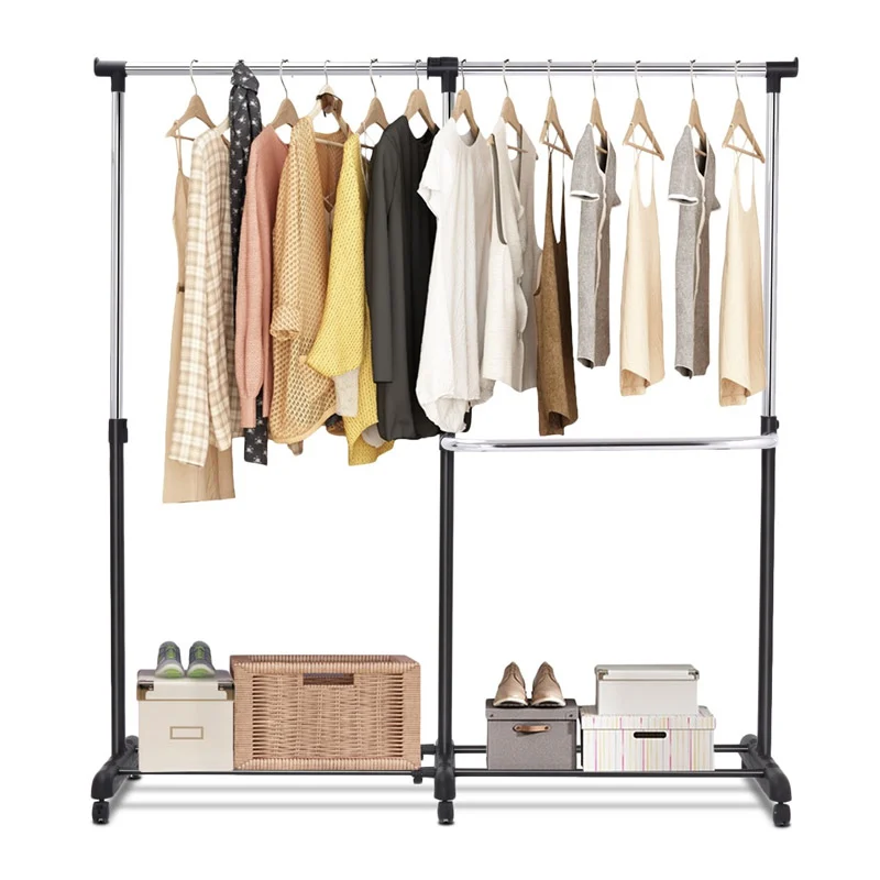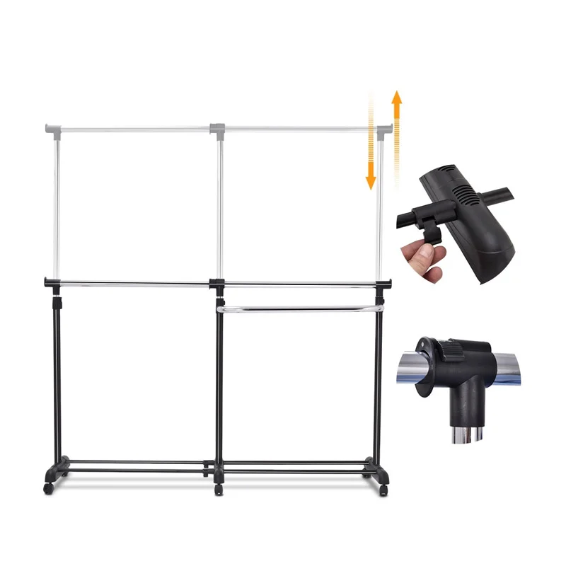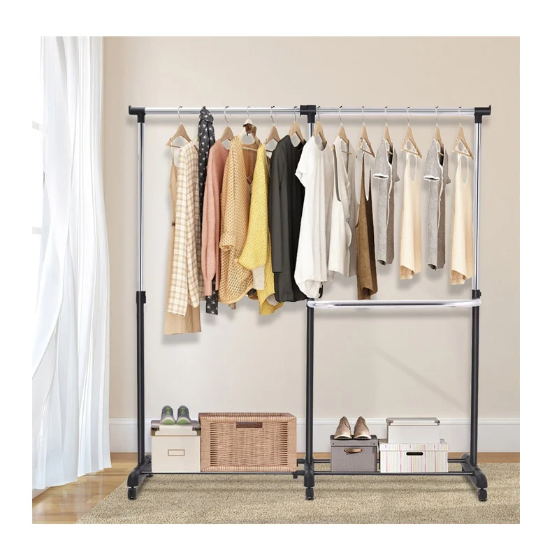 Η κρεμάστρα, διαθέτει σχεδιασμό διπλής ράβδου σε διαφορετικά ύψη, προσφέροντας έτσι περισσότερο χώρο για να ταξινομήσετε και να στεγνώσετε τα ρούχα. Υπάρχει επίσης ένα χαμηλότερο ράφι για επιπλέον χώρο αποθήκευσης. Διαθέτει ρυθμιζόμενο ύψος από 91-160 cm, ενώ το μήκος αριστερά είναι ρυθμιζόμενο από 93-168 cm. Ιδανική για το υπνοδωμάτιο, με εύκολη συναρμολόγηση και μοντέρνο σχεδιασμό.