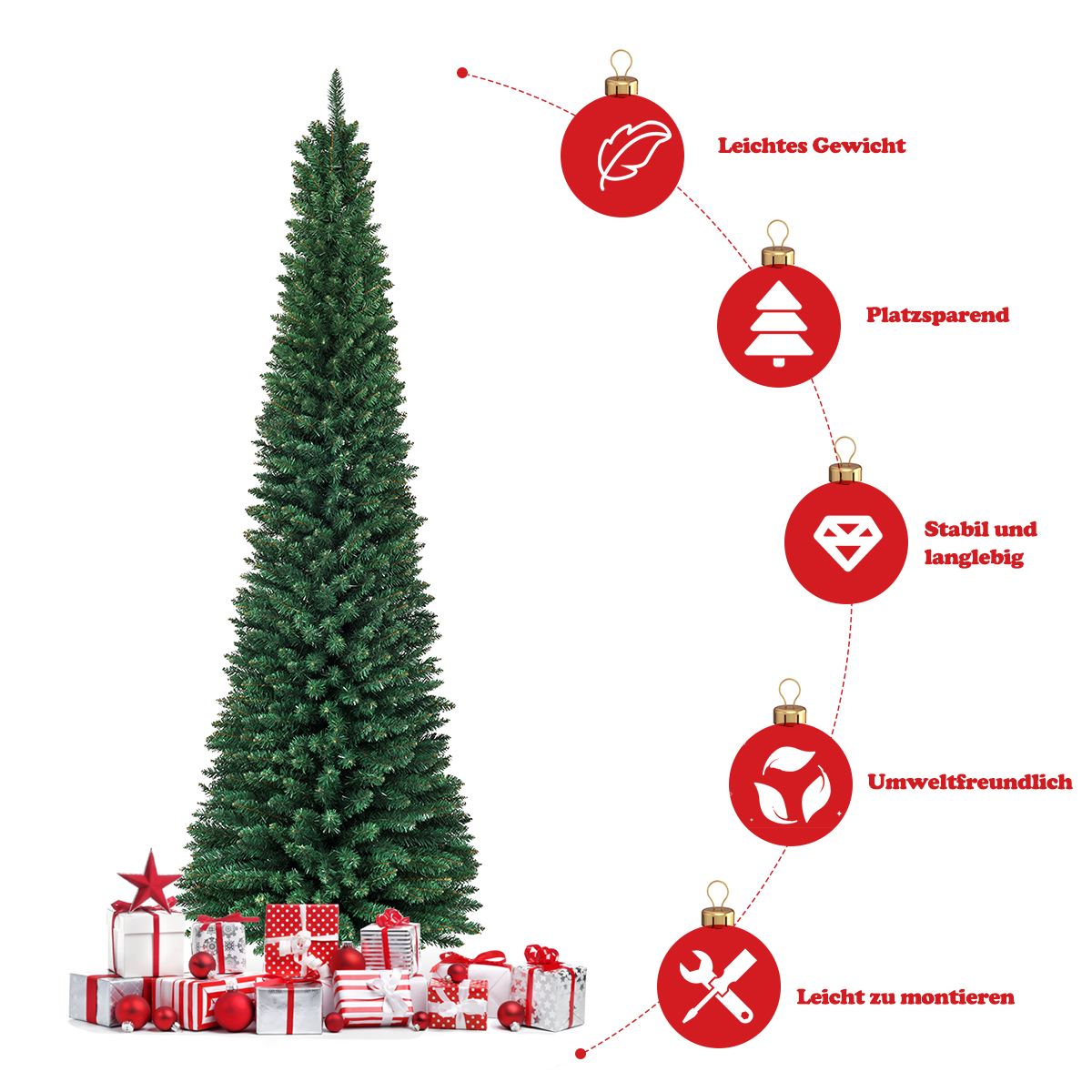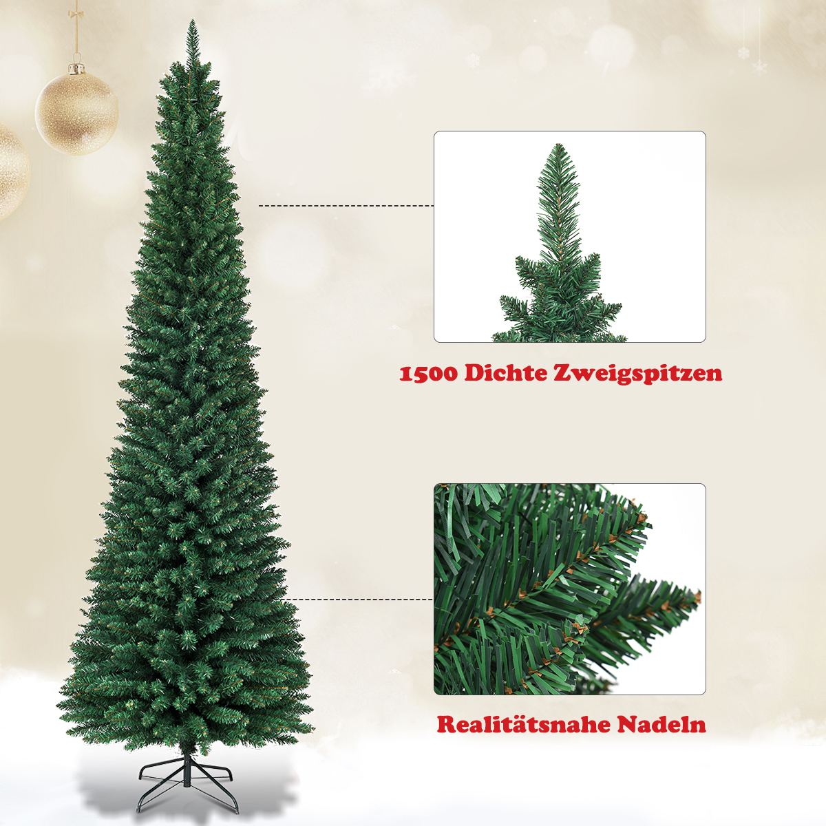 - Πυκνά κλαδιά και ρεαλιστικές PVC βελόνες: Οι βελόνες του χριστουγεννιάτικου δέντρου είναι κατασκευασμένες από υψηλής ποιότητας, φιλικό προς το περιβάλλον PVC, είναι απόλυτα ασφαλείς στη χρήση και προσφέρουν μια εκλεπτυσμένη εμφάνιση που προσεγγίζει την αίσθηση ενός φυσικού δέντρου. Με 1500 άκρες κλαδιών και την απλή, πράσινη χρώση, αναπαριστούν έναν αληθινό χριστουγεννιάτικο δέντρο.