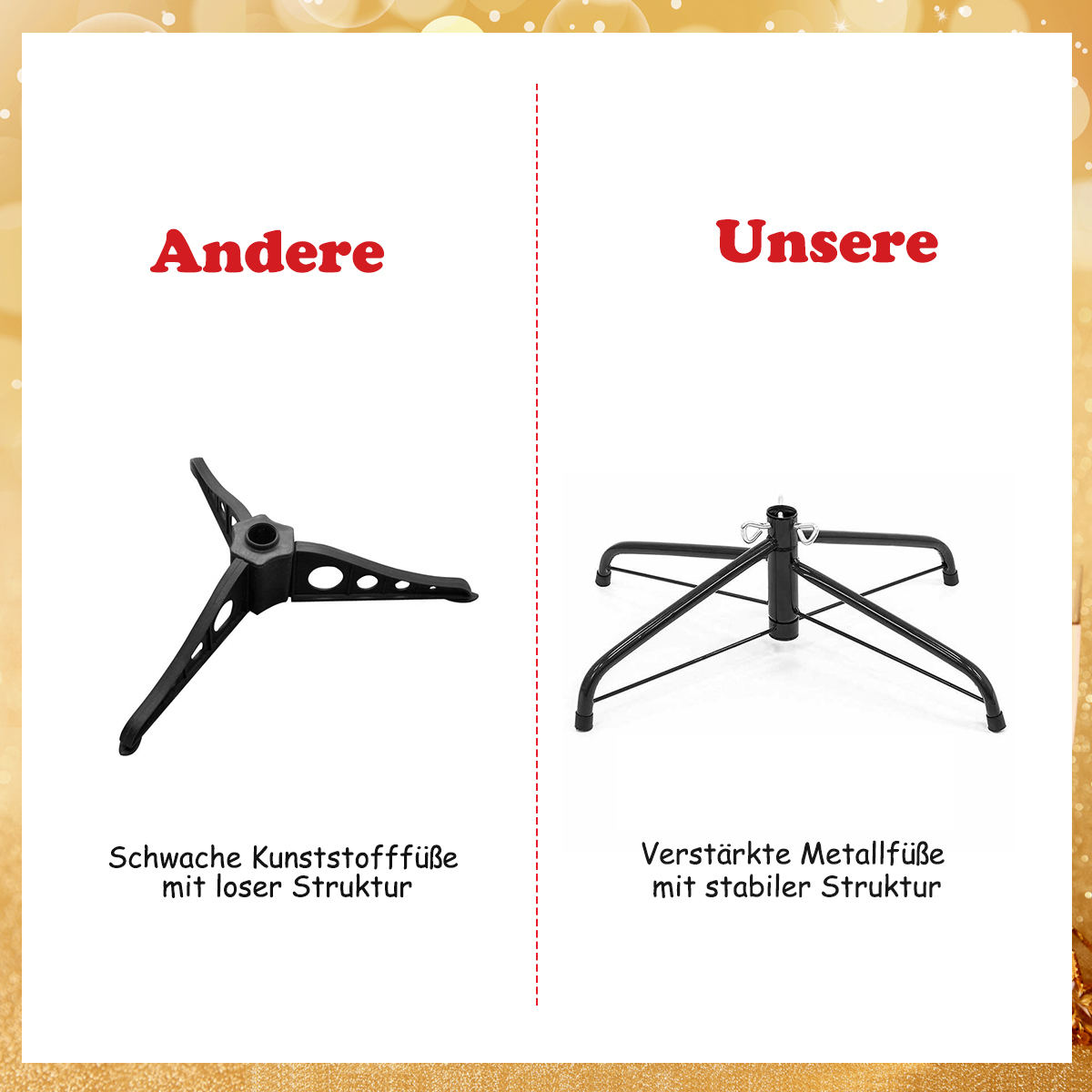 - Ανθεκτική μεταλλική βάση: Εξοπλισμένο με μια γερή βάση από σίδερο που προσφέρει σταθερότητα και αντοχή στον χρόνο. Σε σύγκριση με μια φθηνή πλαστική βάση, η δική μας προσφέρει καλύτερη στήριξη και ισορροπία, διατηρώντας το δέντρο σε όρθια θέση και αποτρέποντας τη φθορά.