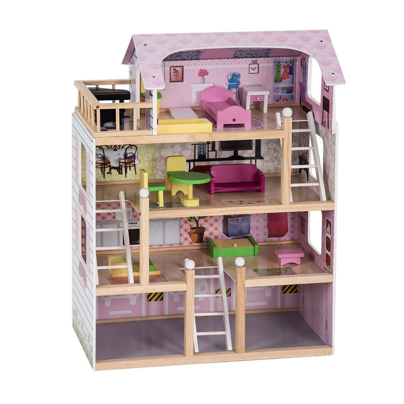 Ξύλινο Κουκλόσπιτο 4 Ορόφων με Αξεσουάρ 60.5 x 29.5 x 81 cm Costway TY325134