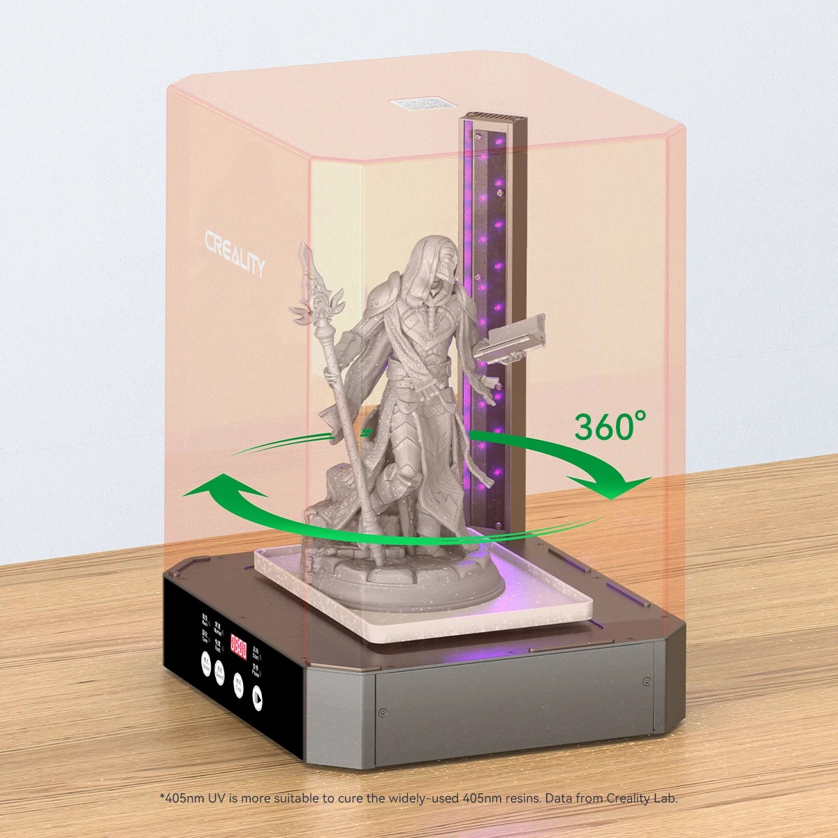 Μια ενισχυμένη συστοιχία LED UV 405nm* επιφέρει έντονη έκθεση στην υπεριώδη ακτινοβολία. Καθώς περιστρέφεται, η επιφάνεια του μοντέλου στερεοποιείται γρήγορα και ομοιόμορφα. Έτσι, οι εκτυπώσεις σας μπορούν να γίνουν ισχυρές και ανθεκτικές.