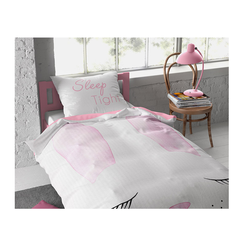 Το παιδικό σετ, από την εταιρία Dreamhouse, αποτελείται από μία μονή παπλωματοθήκη και 1 μαξιλαροθήκη. Είναι κατασκευασμένη από 100% βαμβάκι, αναπνέει, απορροφά εύκολα την υγρασία και είναι διαπερατή από τον αέρα. Διαθέτει σχέδιο με ένα χαριτωμένο κουνελάκι.