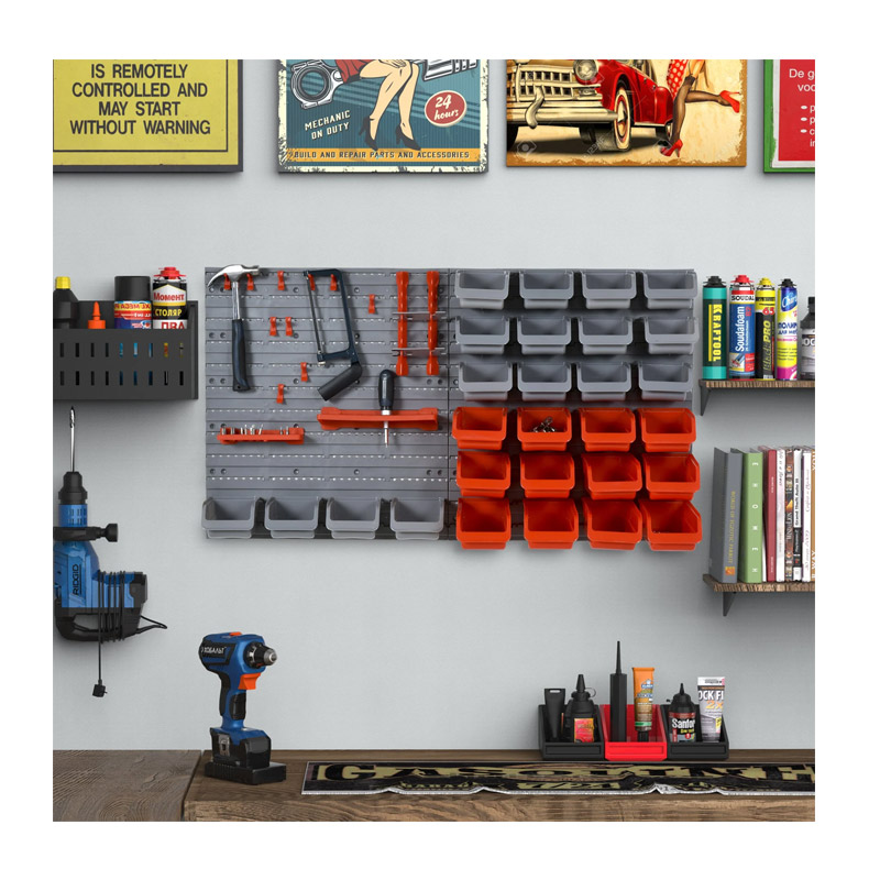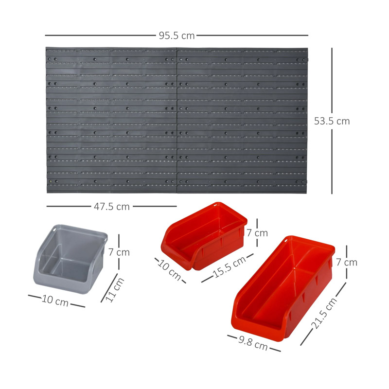 Το σύστημα αποθήκευσης εργαλείων, θα σας βοηθήσει να έχετε πάντα οργανωμένα τα εργαλεία σας, για άμεση και εύκολη πρόσβαση. Πρακτικό, με κουτιά διαφορετικών μεγεθών, σας επιτρέπει να οργανώσετε μικρά αντικείμενα πιο εύκολα, όπως βίδες, καρφιά, παξιμάδια κ.λπ. Τα κουτιά είναι αφαιρούμενα και στοιβάζονται το ένα πάνω από το άλλο. Τα 2 πάνελ είναι εύκολο να τοποθετηθούν στον τοίχο και μπορούν να τοποθετηθούν οριζόντια ή κάθετα ανάλογα με τις ανάγκες του χώρου σας. Κάθε κουτί διατίθεται σε 3 διαφορετικά μεγέθη.