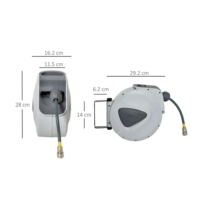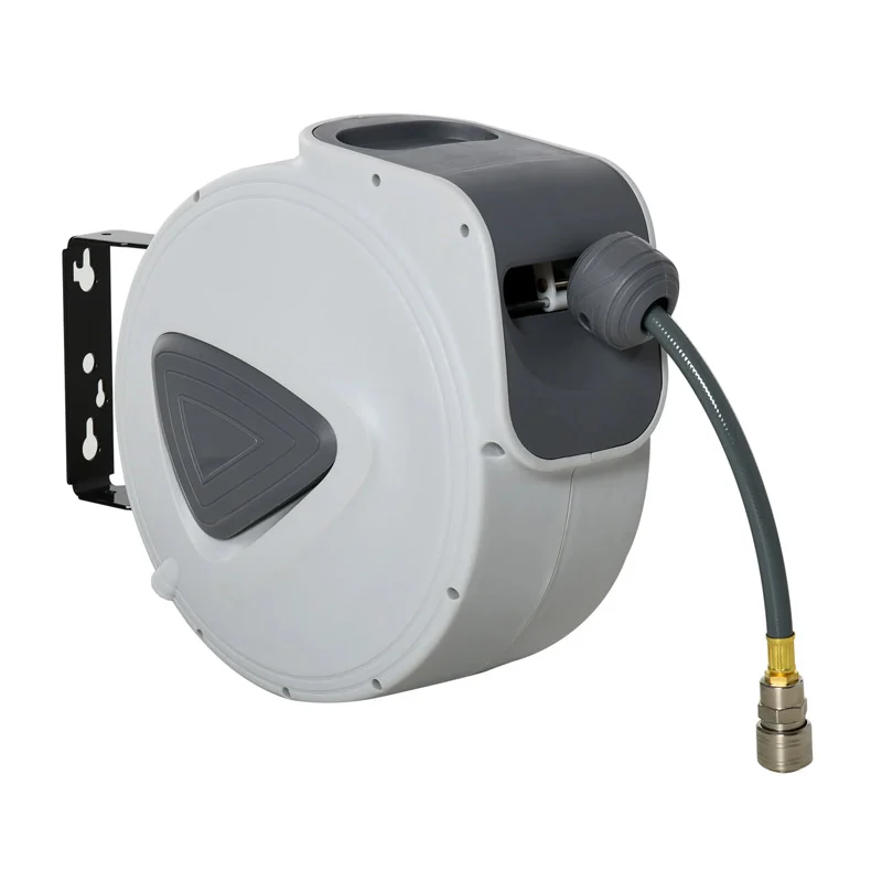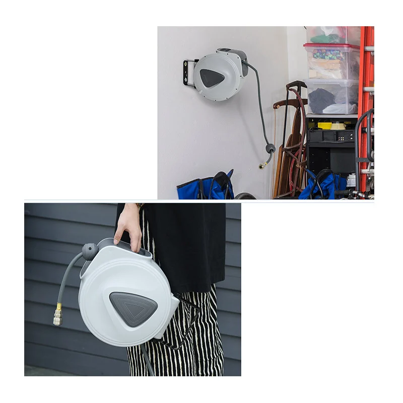 Το καρούλι του εύκαμπτου σωλήνα είναι κατασκευασμένο από ανθεκτικό PP και το εξάρτημα εισόδου και εξόδου είναι από ατσάλι με ψευδάργυρο. Εξοπλισμένο με βάση στήριξης, η οποία περιστρέφεται έως 180 °. Μπορεί να τοποθετηθεί στον τοίχο ή να μεταφερθεί εύκολα με τη λαβή στο πάνω μέρος. Συμβατή για σύνδεση με κομπρεσέρ αέρος και αξεσουάρ πεπιεσμένου αέρα, η μέγιστη πίεση είναι 18 Bar και μπορεί να χρησιμοποιηθεί σε θερμοκρασία από -5 έως 45 ° C.