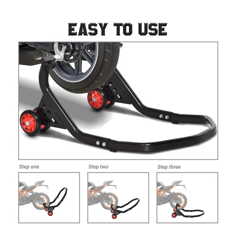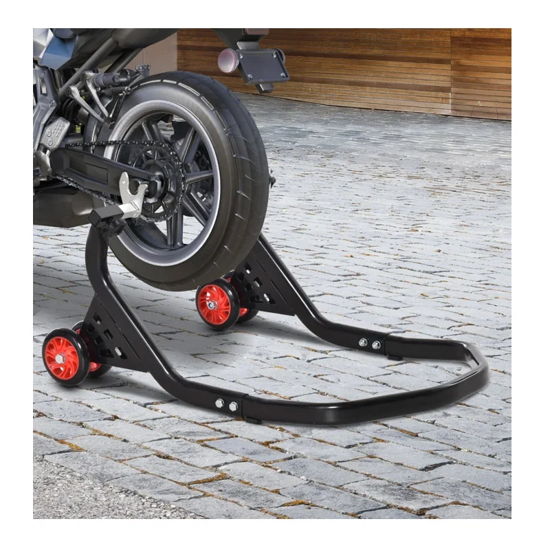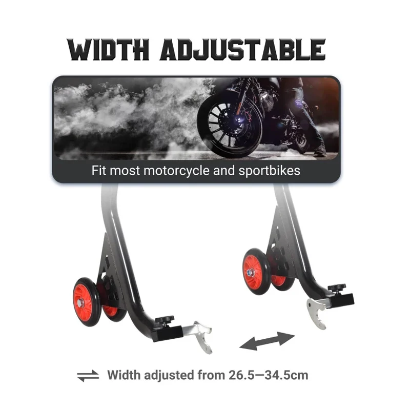 Η βάση ανύψωσης οπίσθιου τροχού, από την εταιρία DURHAND, είναι σχεδιασμένη για μοτοσικλέτες έως 200 Kg. Διαθέτει σκελετό από μέταλλο υψηλής ποιότητας για να σας παρέχει τη μέγιστη δυνατή υποστήριξη. Χρησιμοποιώντας το περιστρεφόμενο πόμολο μπορείτε να την μεγεθύνετε και να την προσαρμόσετε στο μέγεθος του οχήματός σας. Έχει 2 τροχούς PU στο κάτω μέρος για να σας βοηθήσουν να μετακινείτε τη μηχανή άνετα.