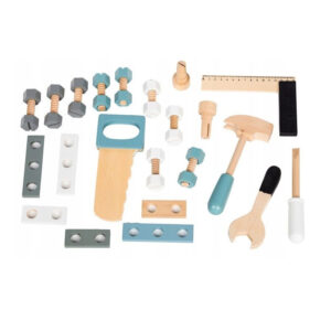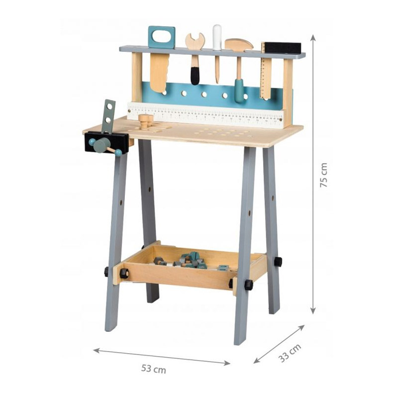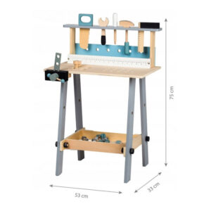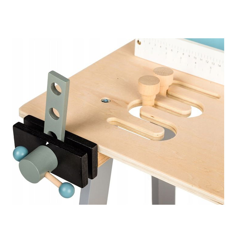 Το παιχνίδι είναι κατασκευασμένο εξ ολοκλήρου από ξύλο, βαμμένο με ασφαλή για παιδιά μπογιά. Το εργαστήριο αποτελείται από ένα ξύλινο ράφι, μια μέγγενη και έναν τοίχο με εργαλεία. Περιλαμβάνει κατάλληλα εργαλεία όπως πριόνι, κλειδί, κατσαβίδι, σφυρί και χάρακα. Επιπλέον, περιλαμβάνει βίδες, παξιμάδια και ξύλινες ροδέλες, που μπορούν να βιδωθούν στον πάγκο. Το προϊόν είναι 100% ασφαλές για παιδιά.